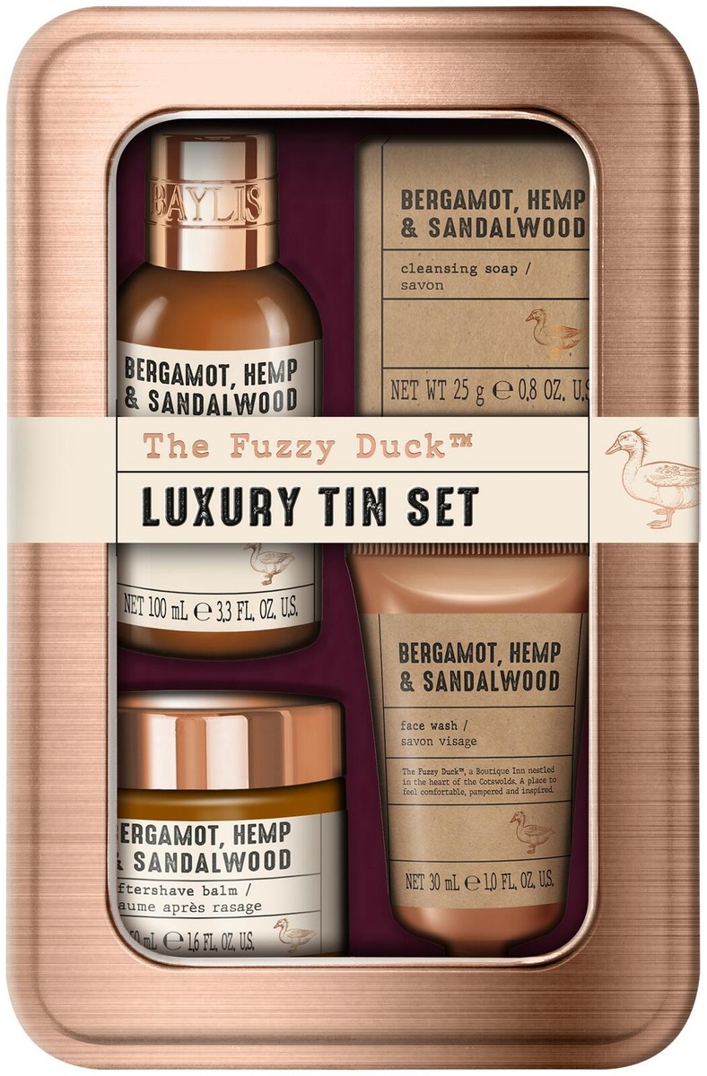 Baylis & Harding The Fuzzy Duck Bergamot, Hemp & Sandalwood -kokoelma sopii jokaiselle hienostuneen maun omaavalle herrasmiehelle. Tuoksussa on havaittavissa savuista puun ja hampun lämpöä ja pehmeyttä sekä bergamotin, sitruunan ja piparmintun raikkautta. Pakkaukseen sisältyy 100 ml pullo hiusten ja vartalon pesugeeliä, 50 ml purkki aftershave-balsamia, 30 ml tuubi kasvojenpesugeeliä ja 25 g palasaippua.