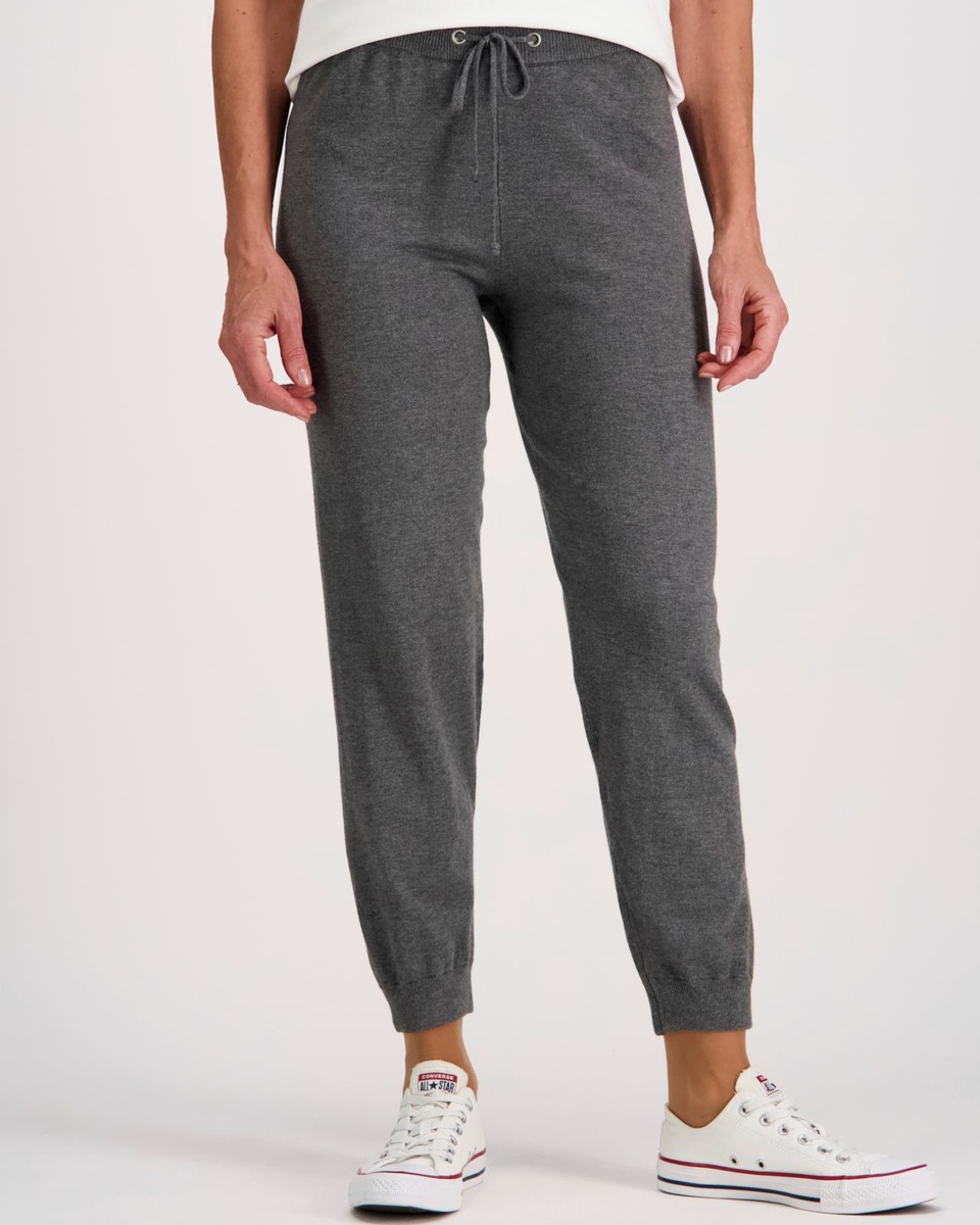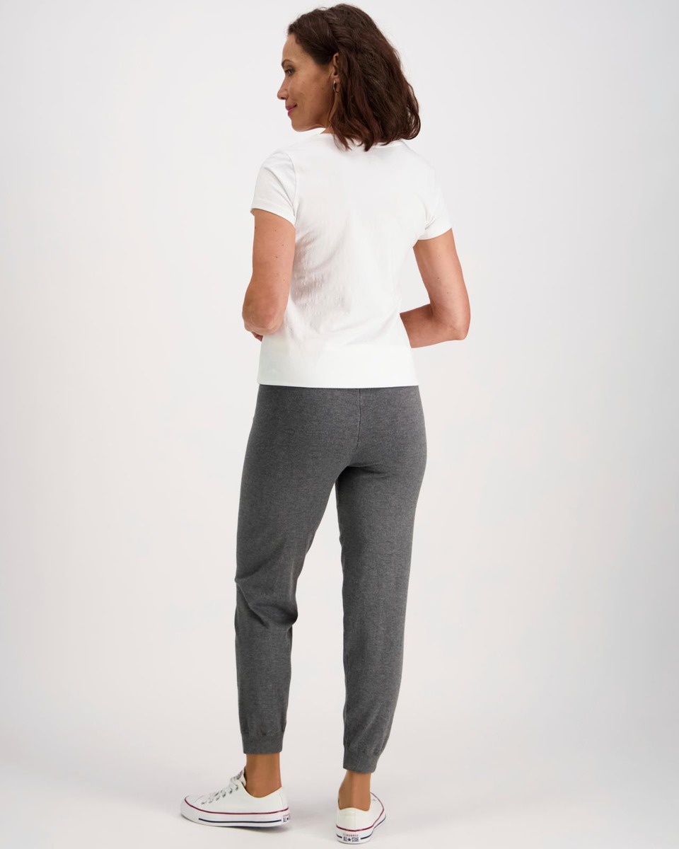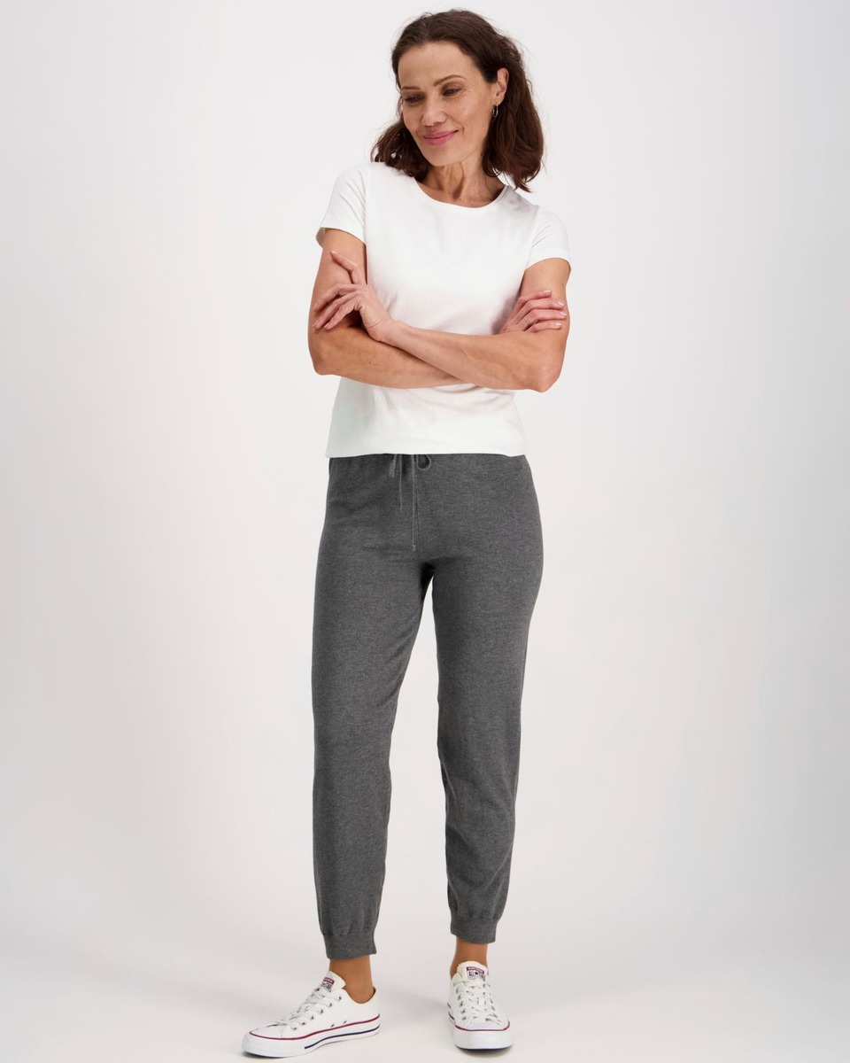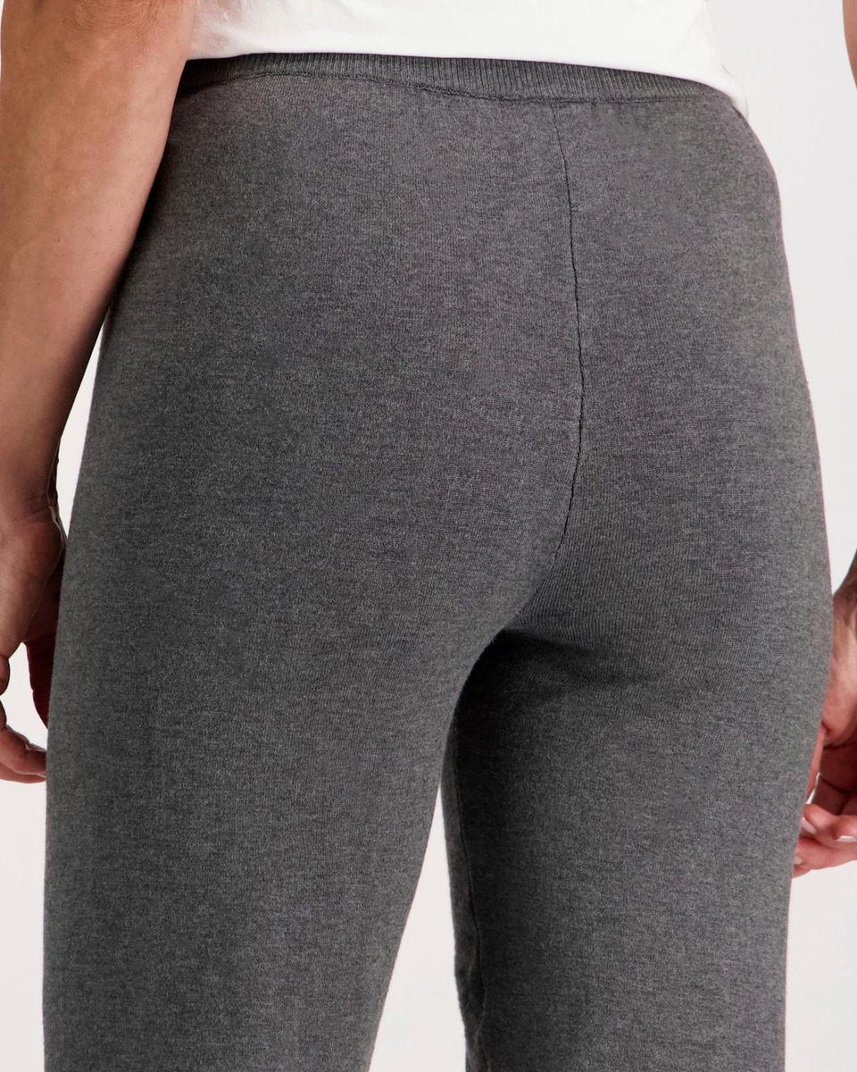 Ajattomat neulehousut joustavalla vyötärönauhalla ja ribneuloksella lahkeensuissa. Koossa M vyötärönympärys venyttämättömänä noin 77 cm, pituus vyötärön yläreunasta lahkeensuuhun noin 99 cm. Materiaali miellyttävää ja hieman joustavaa viskoosi-polyamidia.