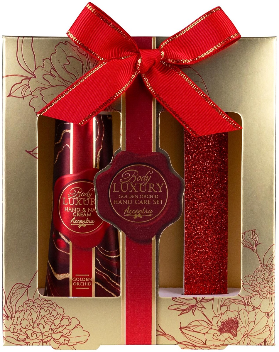 Accentra Body Luxury Golden Orchid lahjapakkaus, joka sisältää käsivoiteen 30ml and kynsiviilan. Tuoksuna Golden Orchid.