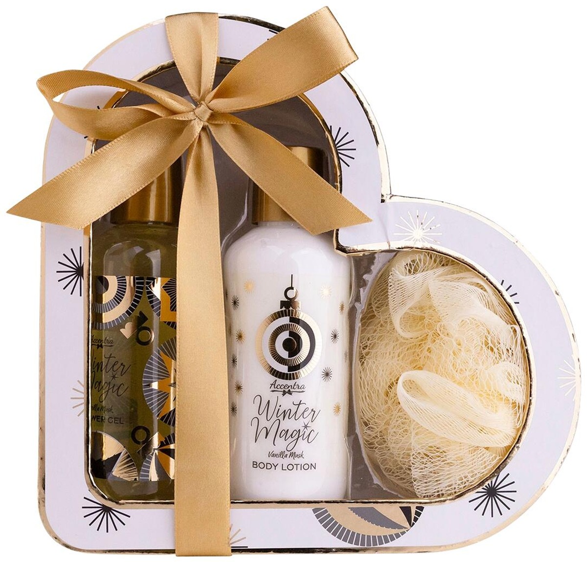 Accentra Winter Magic Vanilla Musk lahjapakkaus, joka sisältää suihkusaippuan 160ml, vartalovoiteen 160ml ja pesupuffin. Tuoksuna Vanilla Musk.