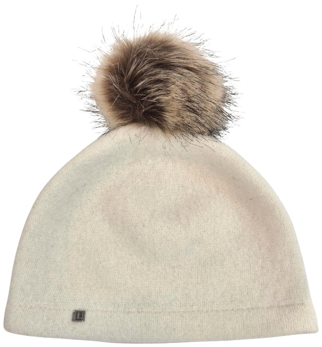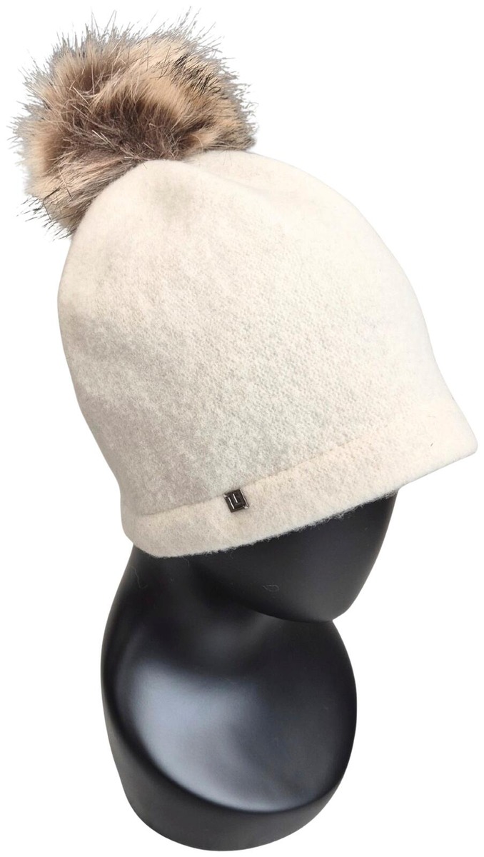 Rento ja lämmin hattu huovutettua villaa. Sileä yksinkertainen malli jossa tekoturkistupsu. Yksi koko.