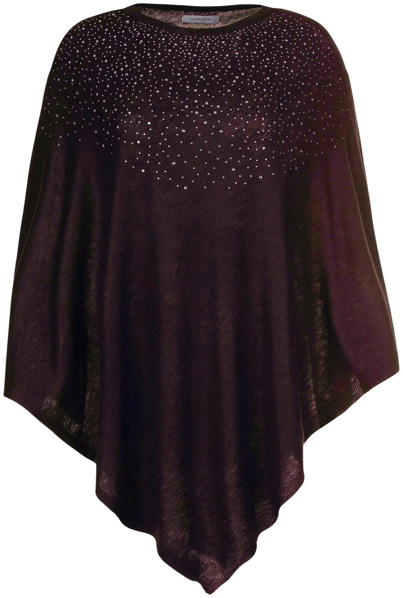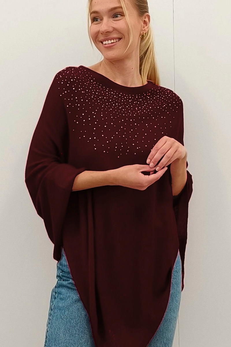 Kevyt monikäyttöinen neuleponcho villasekoitetta. Edessä kaunis strassikoristelu.