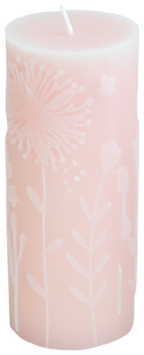 Finnmari vaaleanpunainen pöytäkynttilä, jossa kukkakuvio.