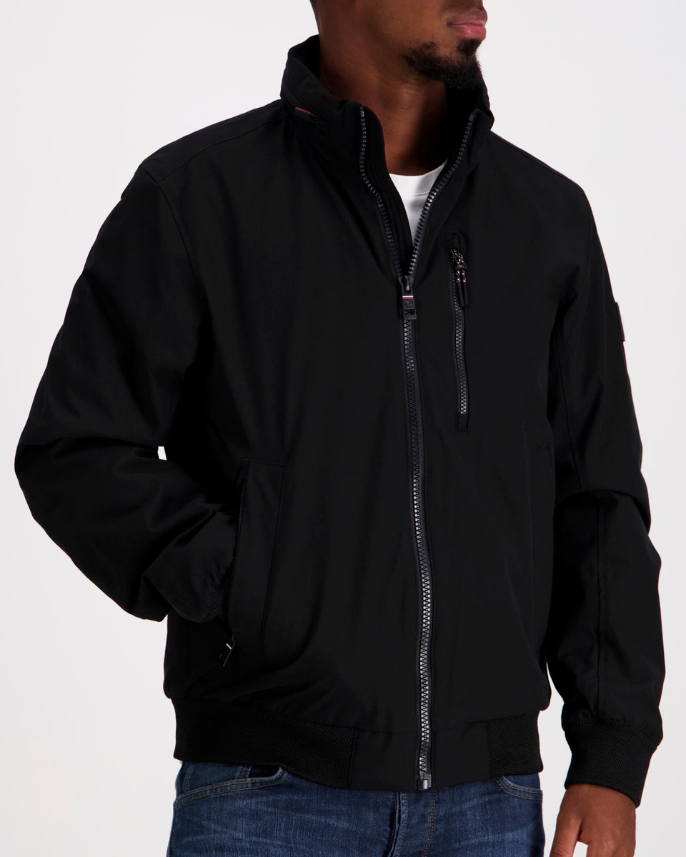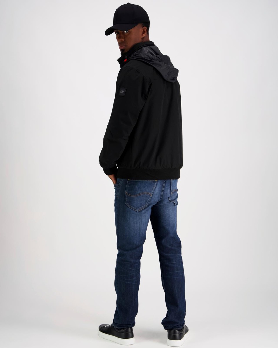 Miesten ulkoilutakki ohuella vanuvuorilla. Pystykauluksen sisällä huppu. Resorit helmassa ja hihansuissa. Vetoketjulliset taskut.