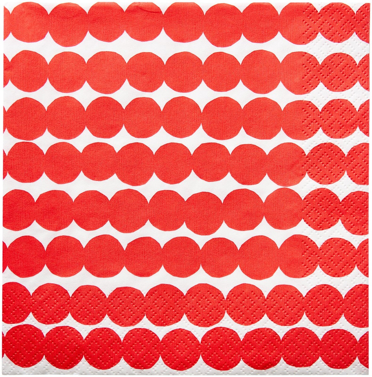 Klassiset Marimekon Räsymatto lautasliinat joulunpunaisessa värityksessä. Kuosin on suunnitellut Maija Louekari vuonna 2009. Kotimaiset lautasliinat ovat Havin valmistamat ja ne ovat painettu Imatralla 3-kertaiselle pehmopaperille. Lautasliinoille on myönnetty Avainlippu, Joutsenmerkki ja FSC.