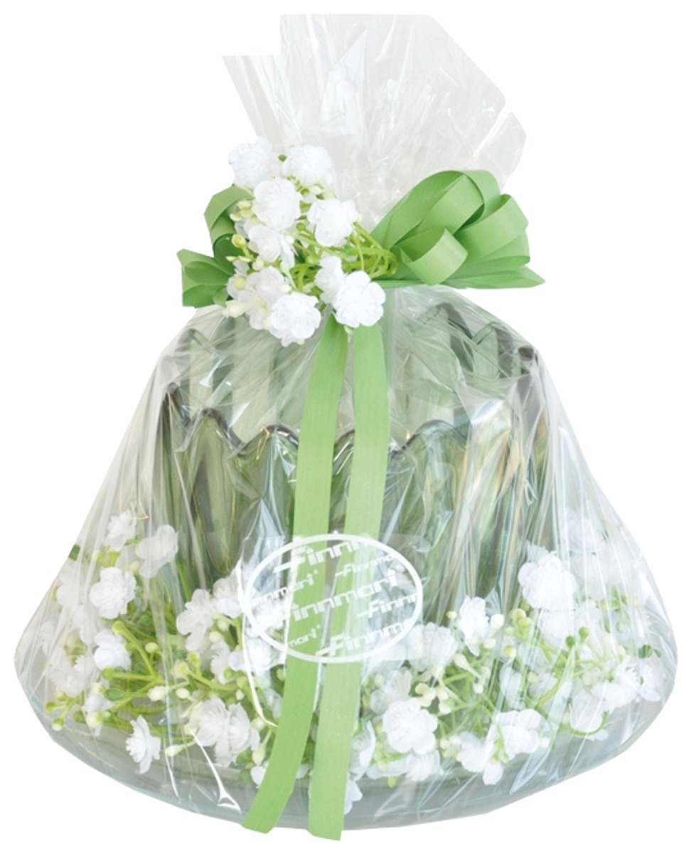 Finnmari lahjapaketti, jossa lasialusta 19cm, harsokranssi, vihreä kynttilälasi+kynttilä sekä harsokoriste.