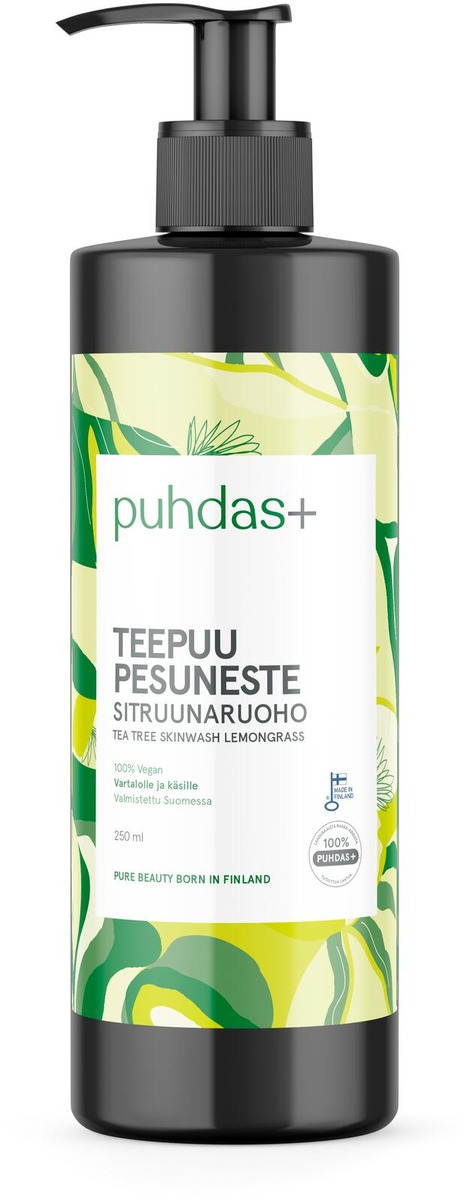 Puhdas+ Tea Tree Skin Wash on täydellinen pesuneste käsille, kasvoille ja vartalolle. Sisältää teepuuöljyä, joka puhdistaa ja hoitaa ihoa, mutta ei kuivata sitä. Teepuu on pieni pensaskasvi, joka kasvaa trooppisessa ilmastossa. Teepuun voimakas suosio perustuu sen tehokkaisiin puhdistaviin ominaisuuksiin. Soveltuu koko perheelle. Pakattu kätevään ja hygieeniseen pumppupulloon.