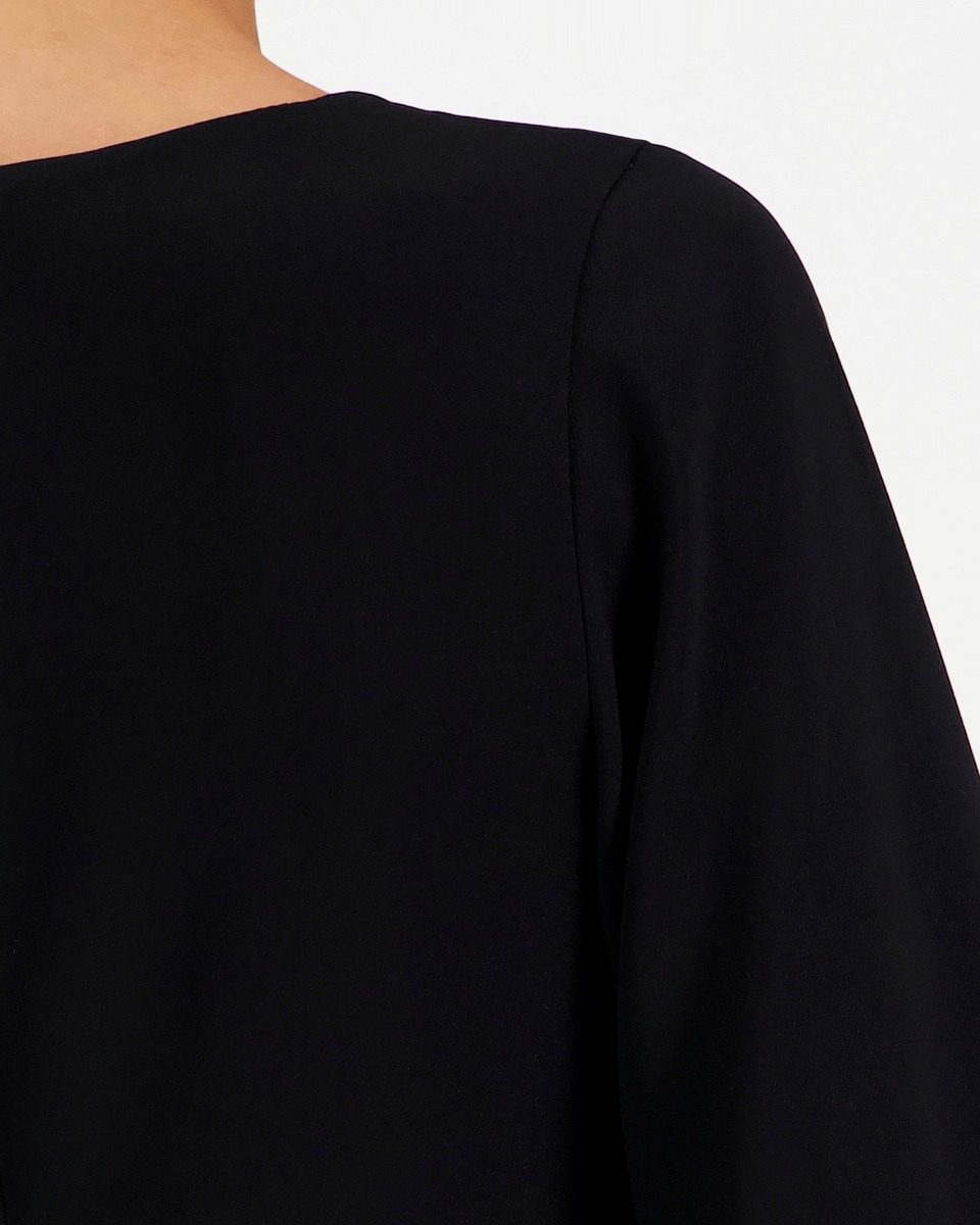 Nova-mekko on klassinen kotelomekko, joka yhdistää ajattoman tyylin ja mukavuuden. Pyöreä pääntie halkiolla luo elegantin ilmeen, ja sen väljät, kevyesti kellotetut 3/4-pituiset hihat lisäävät naisellista charmia. Piilovetoketju selässä viimeistelee siistin ja huolitellun ulkonäön. Kevyesti muotoon ommeltu malli korostaa vartalon kaaria säilyttäen samalla mukavuuden. Mekon helmassa on pallonmuotoinen leikkaus. Mekon pituus hartiasta helmaan koossa S on 100 cm.
