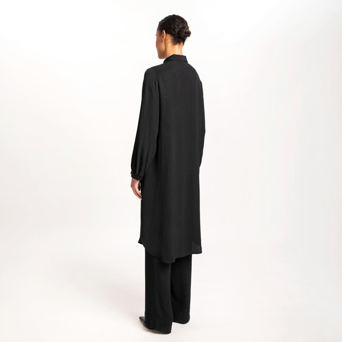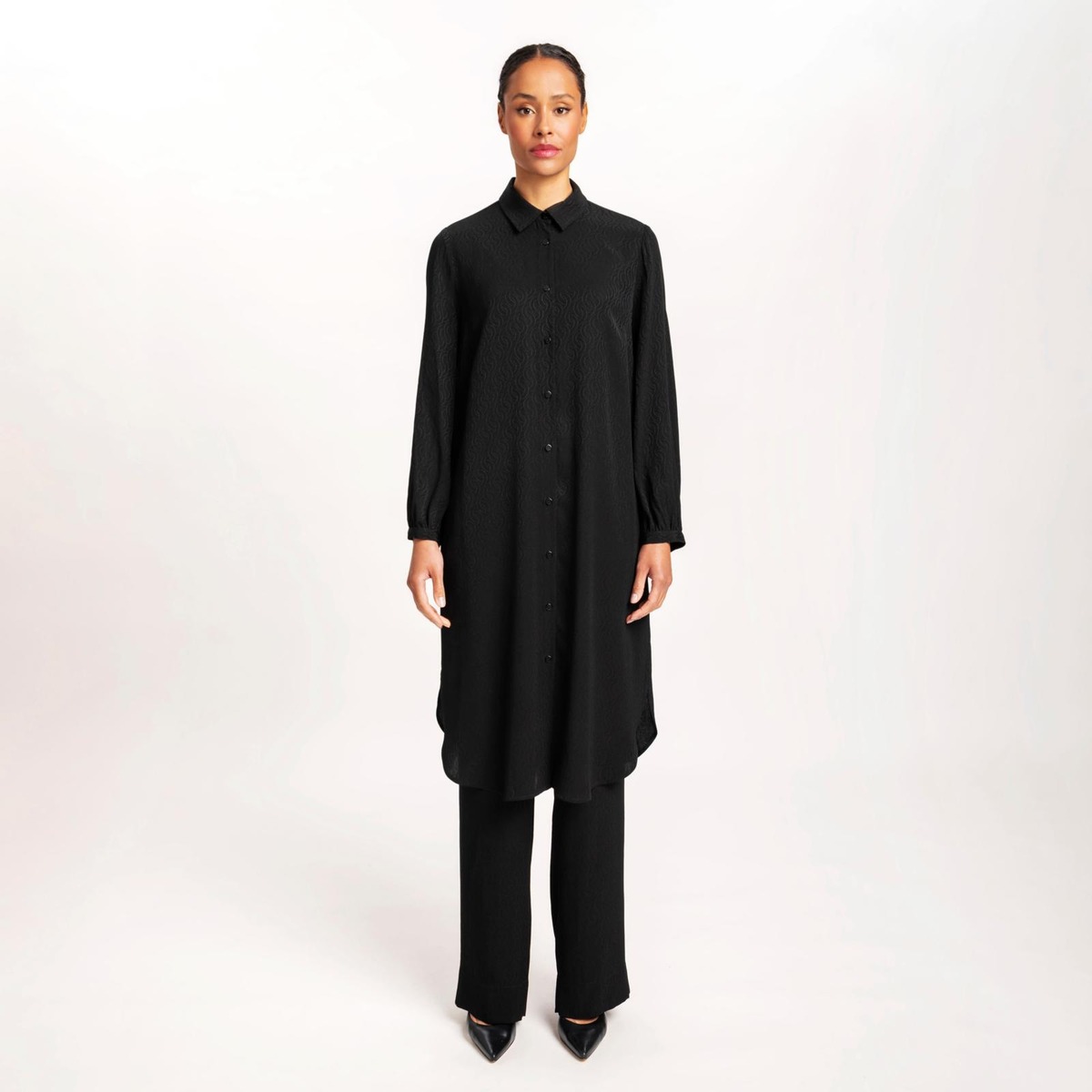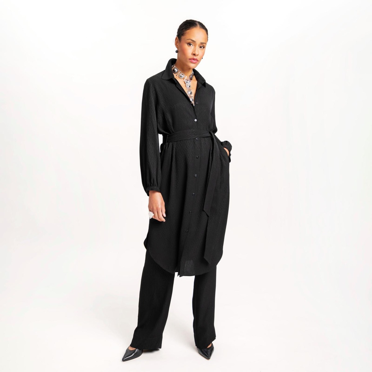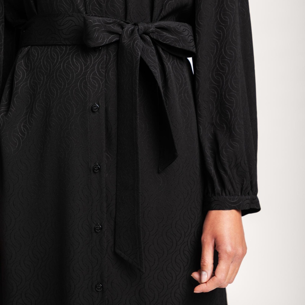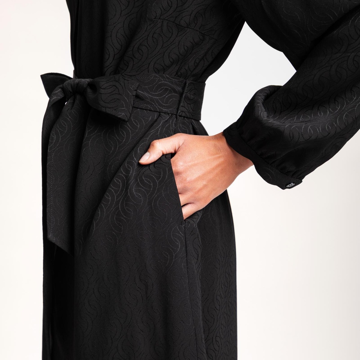 Aarikan Irenia-mekko on valmistettu elegantista kuosillisesta jakardikankaasta. Mekossa on tyylikäs edessä oleva napitus ja vyö, joka korostaa vyötäröäsi. ¾-hihat ja poimutetut hihansuut lisäävät ripauksen hienostuneisuutta, mikä tekee siitä täydellisen valinnan mihin tahansa tilaisuuteen. Vaatteen pituus koossa S on 112 cm.