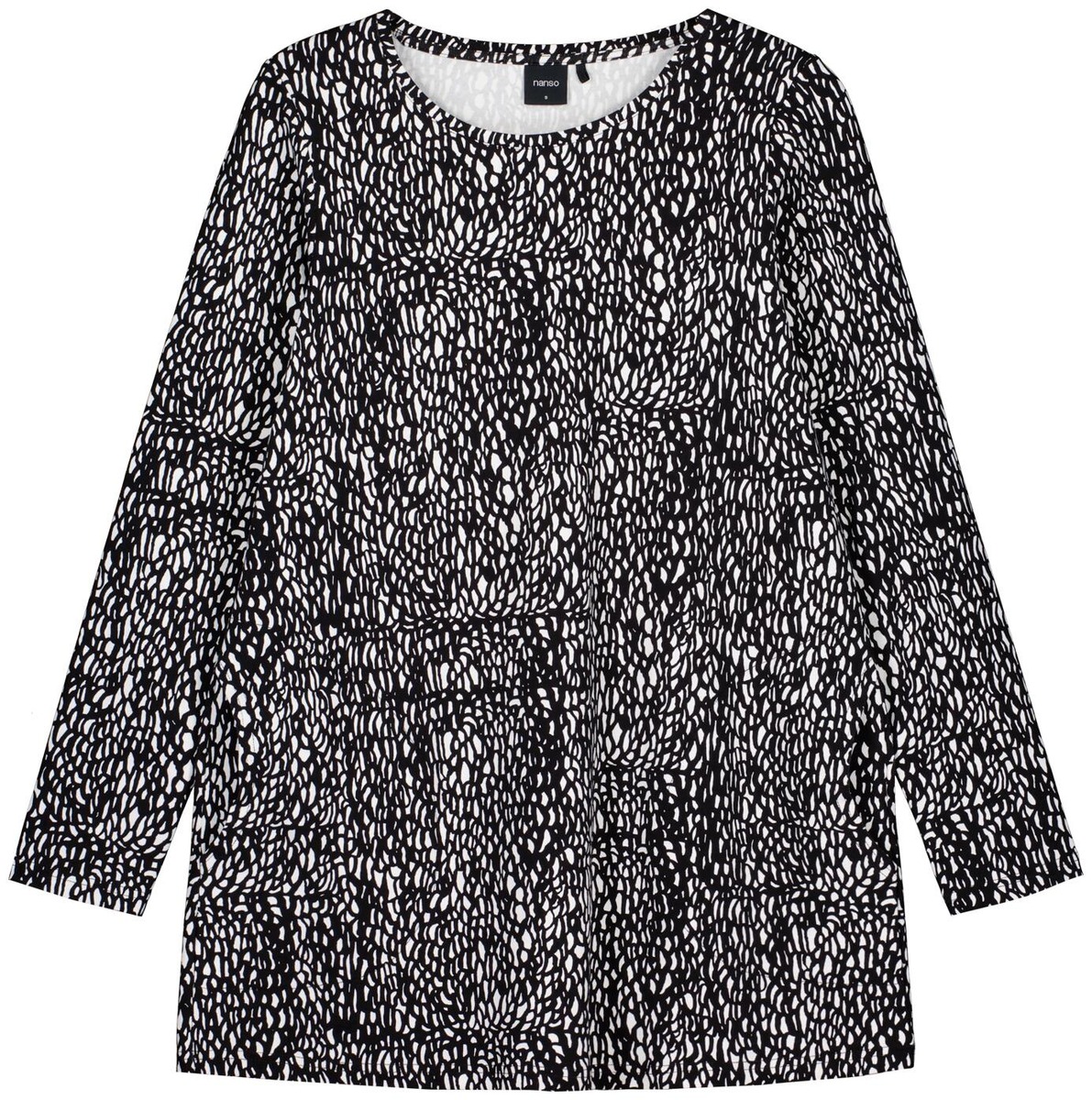 Naisten kuosillinen Raku-tunika. Tunikassa on pyöreä tereellä viimeistelty pääntie, sivuissa taskut ja täyspitkät hihat. Tunikan pituus koossa M on noin 80 cm. Materiaali on miellyttävän tuntuista ja helppohoitoista puuvilla-elastaani-neulosta.