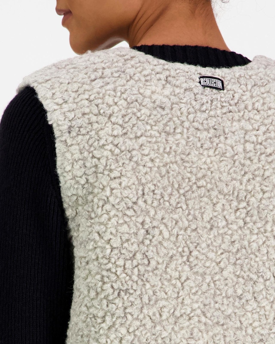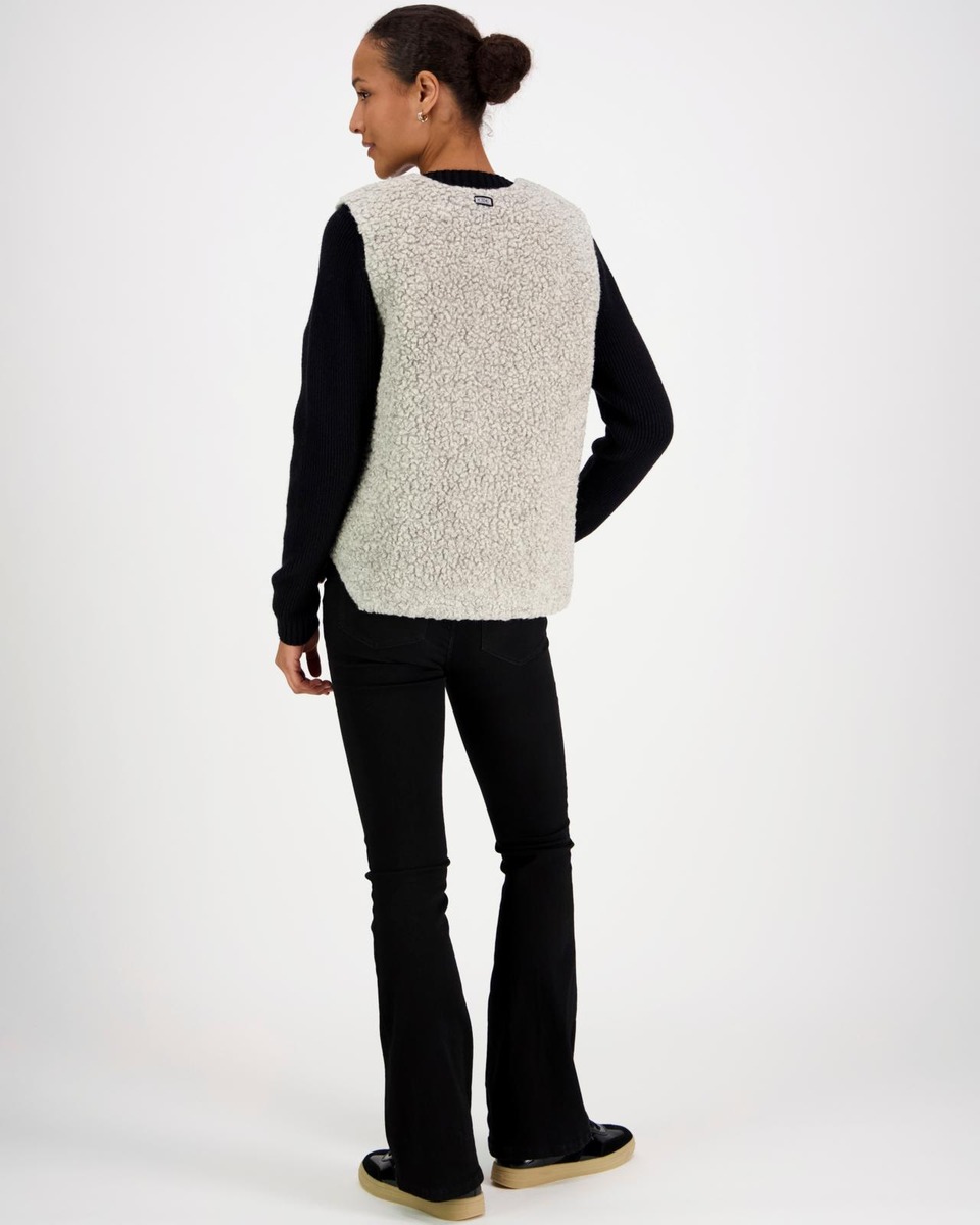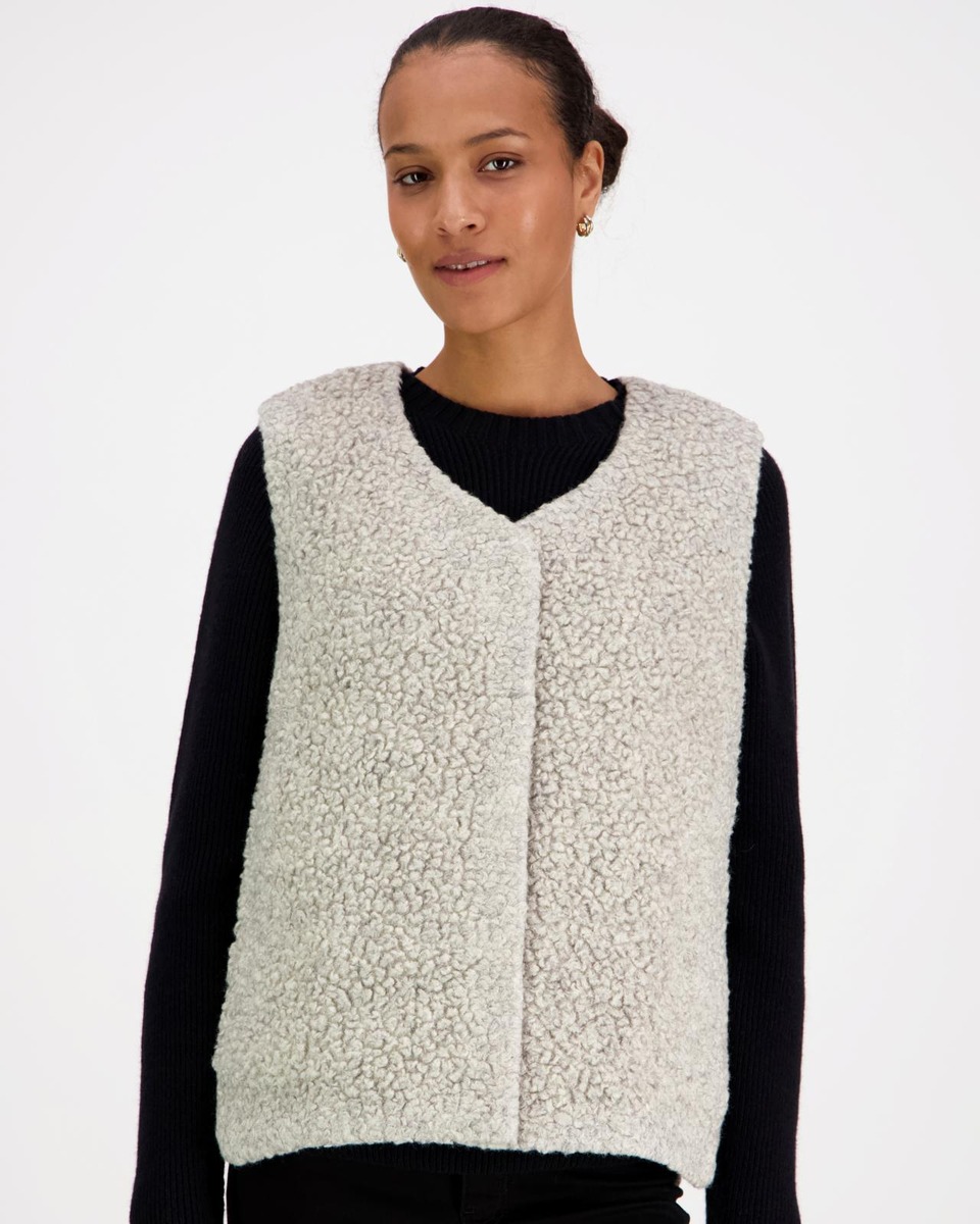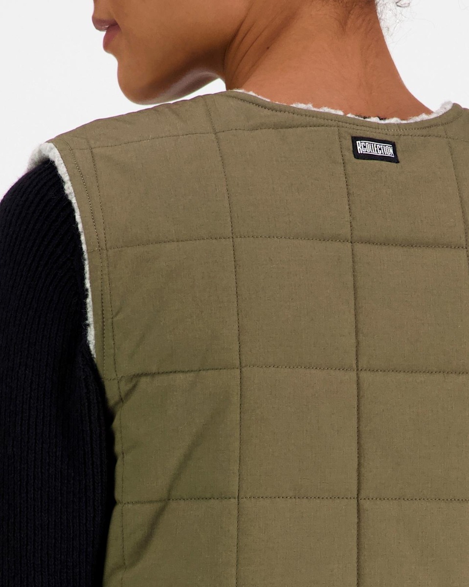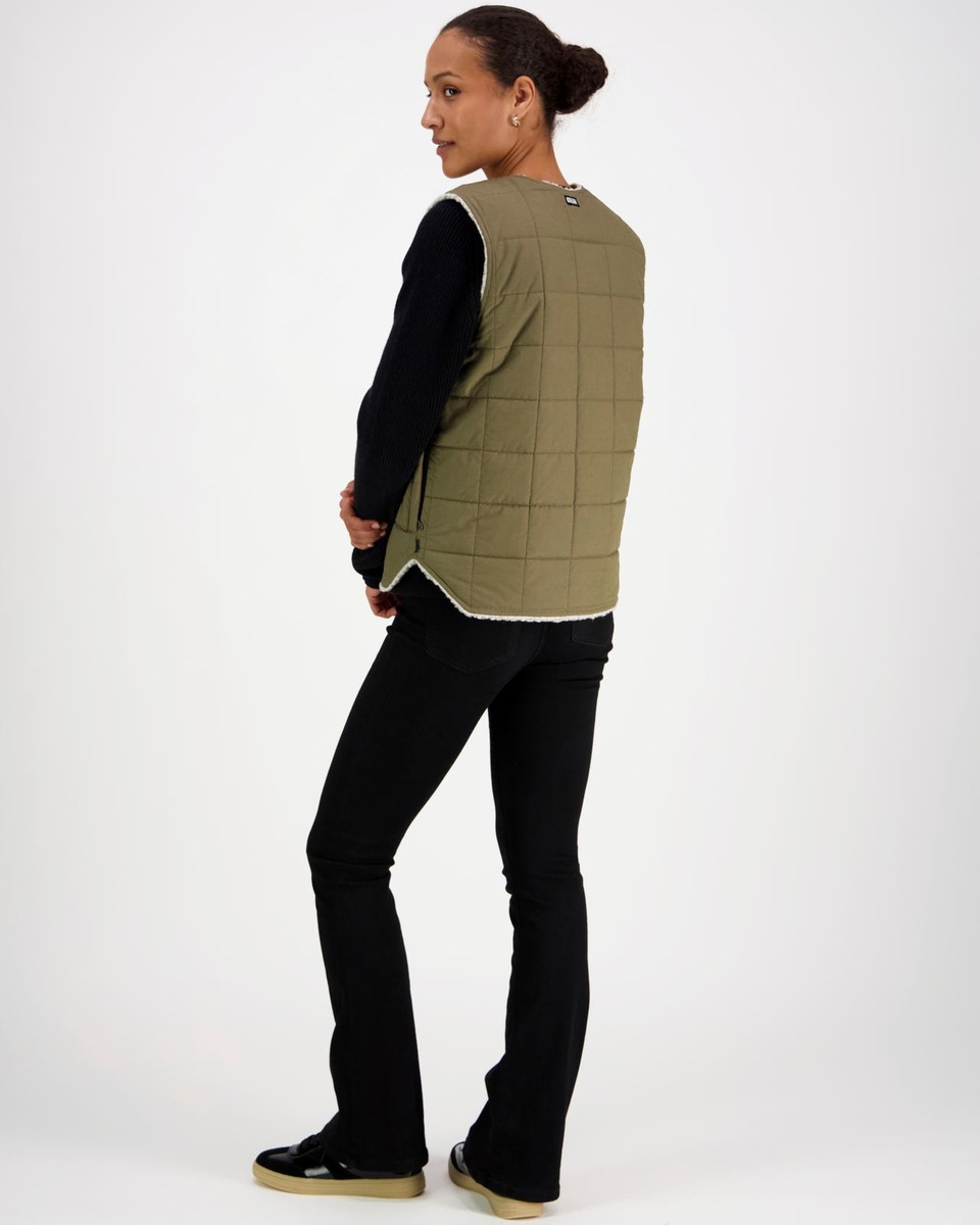 Unisex-mitoituksella valmistettu kääntöliivi. Päällä tikattu vettähylkivä puuvillakangas ja toisella puolella villasekoiteteddykangas. Välissä kevyt vanu. Nepparikiinnitys, ja tikatulla puolella sivutaskut vetoketjuilla. Muotoiltu helma ja sivuilla pienet halkiot. Vuori 40% villa, 30% polyesteri, 30% akryyli.