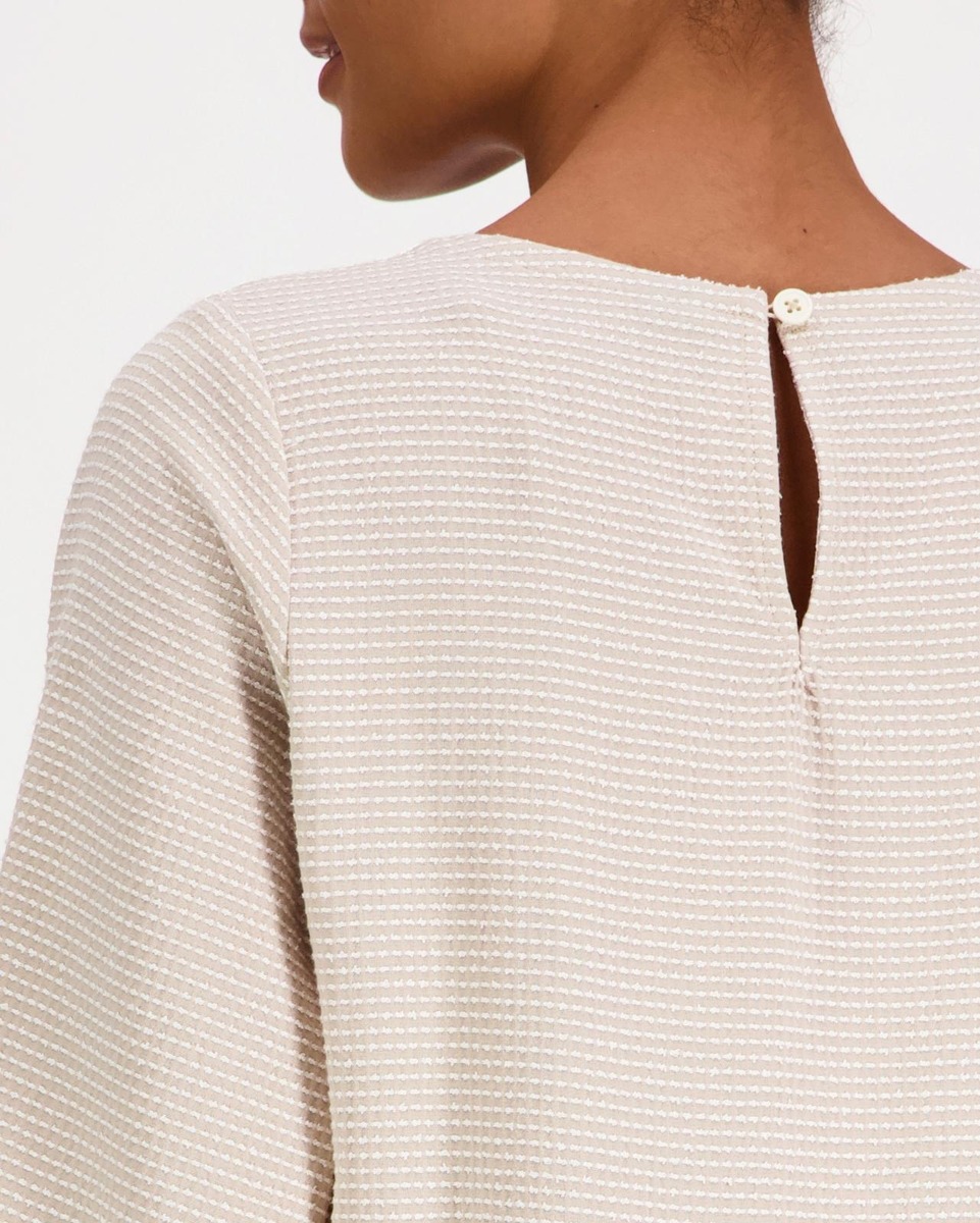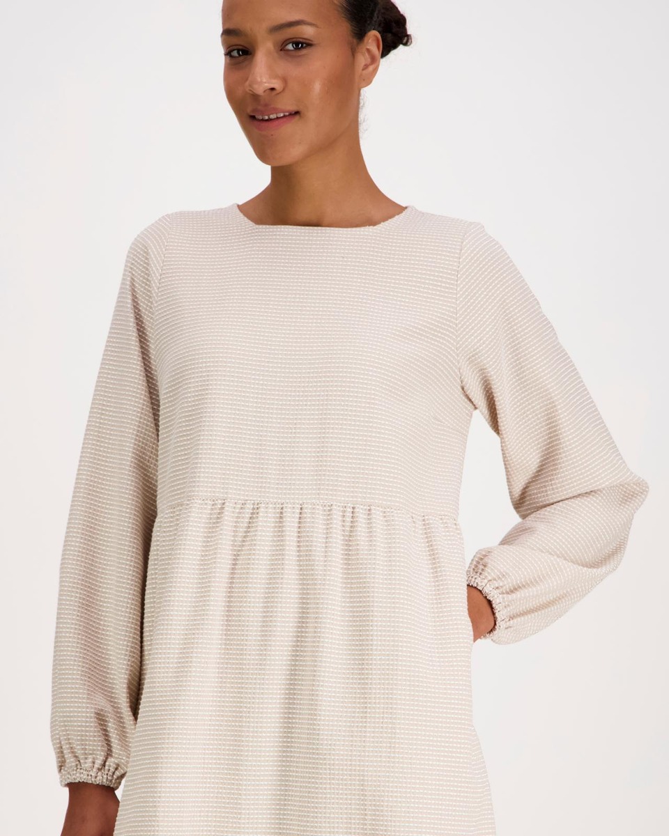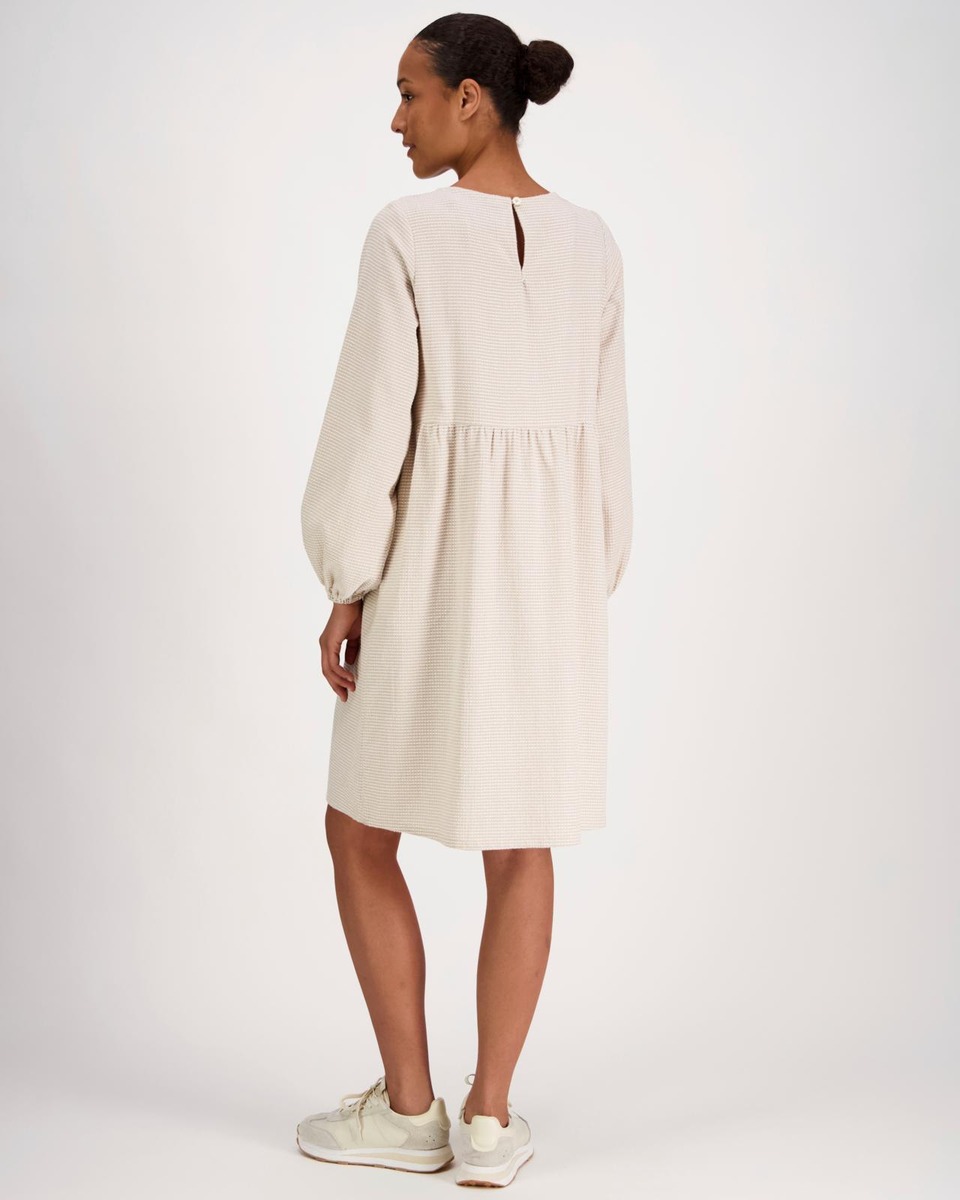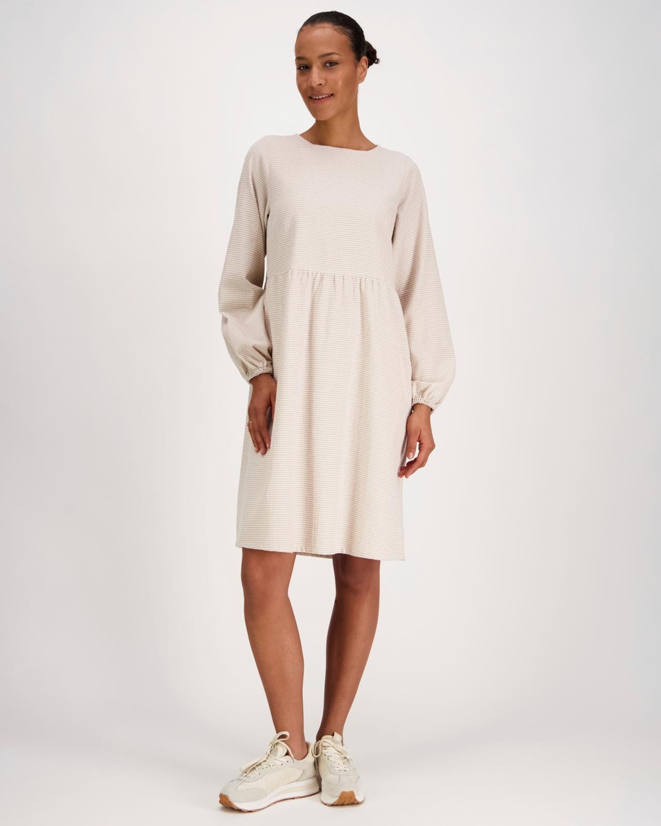 Naisten midimittainen mekko. Muotoiltu pääntie ja niskassa halkio ja nappi. Istutetut pussihihat, hihansuussa kuminauhakiristys. Muotolaskokset rinnan kohdalla, sekä vyötäröllä rypytetty leikkaus. Alaspäin levenevä helma sekä sivusaumataskut.