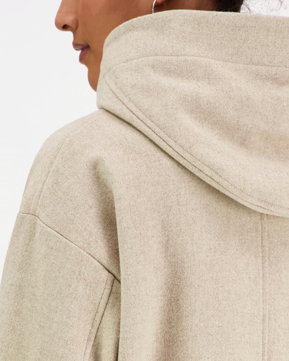 Unisex-mitoituksella tehty pitkä duffelitakki. Raglanhihat kääntövaralla ja tilava huppu. Edessä napit ja pääntiellä irrotettava tamppi. Viistot etutaskut.