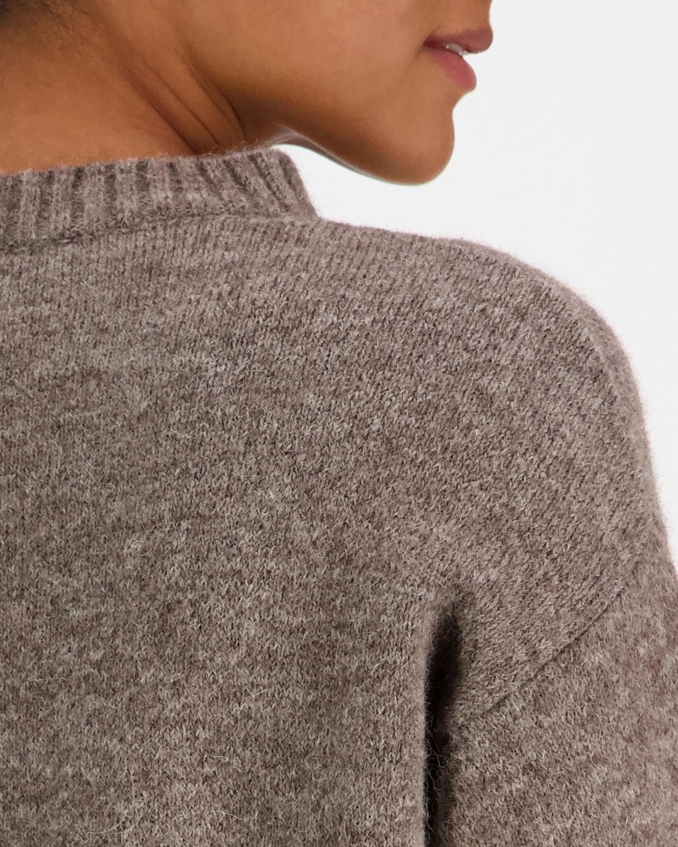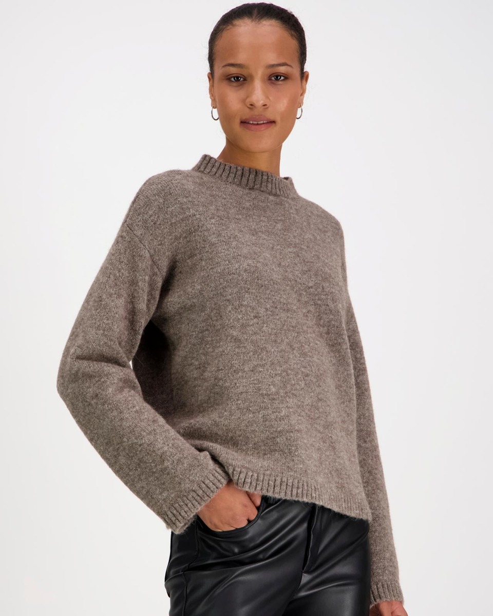 Pehmeästä alpakka-sekoitelangasta valmistettu naisten neulepaita. Väljä malli lasketulla hartialla. Pääntiellä ja hihansuissa resorit.