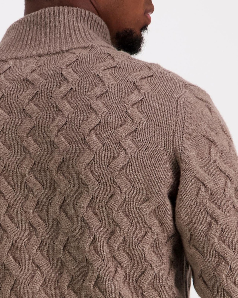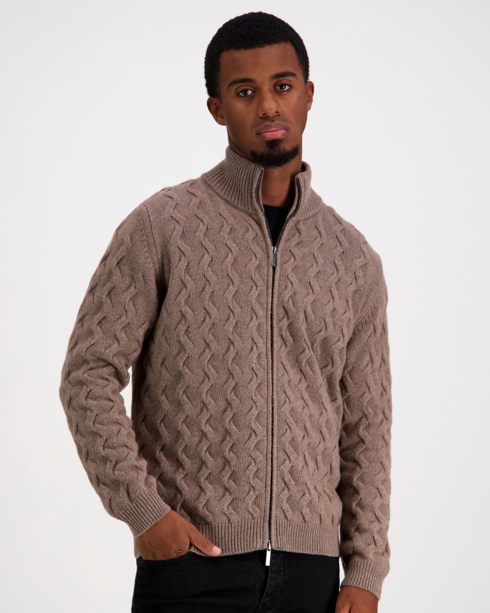 Palmikkokuvioinen neuletakki, jossa korkea kaulus ja edessä kaksisuuntainen vetoketju. Modern fit.