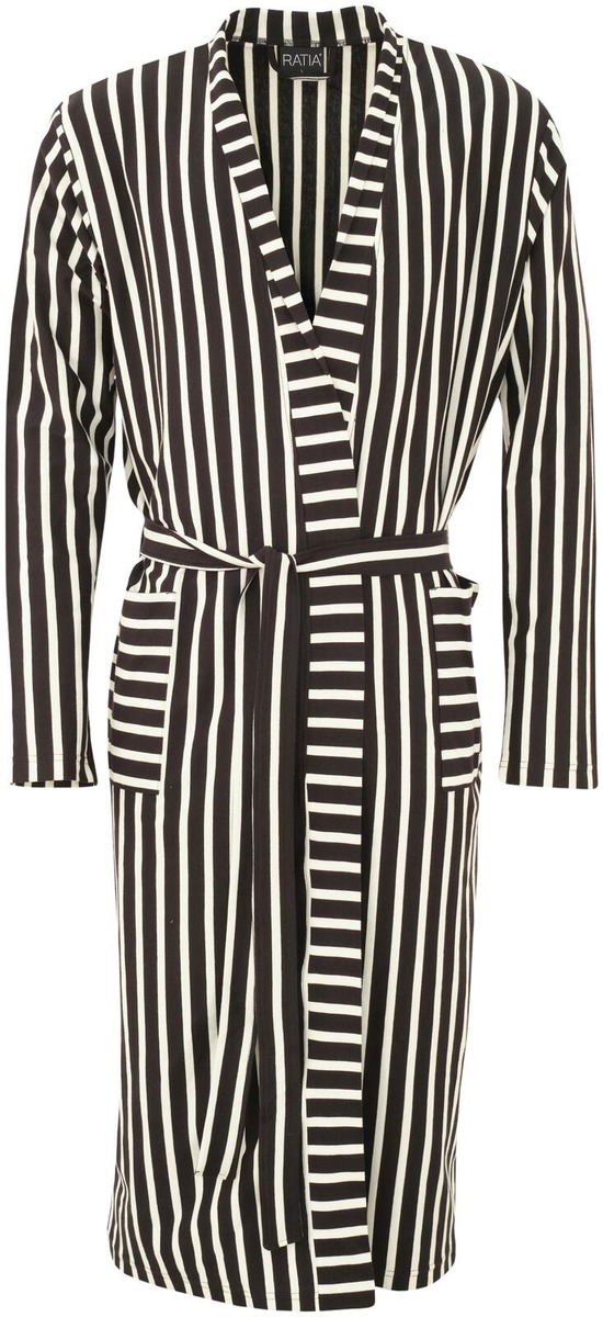 RATIA® trikooaamutakki, joka on miellyttävää 100 % puuvillatrikoota. Raitakuosi antaa takille ryhdikkään ilmeen. Tuote on suomalaisen suunnittelun käsialaa ja sillä on Suomalaisen Työn Liiton, Design From Finland -merkki. Valmistettu Portugalissa.