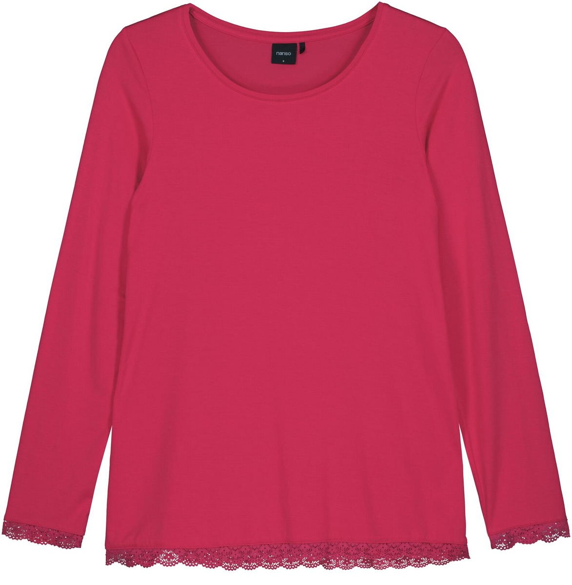 Naisten ylellisen pehmeä Pitsi-pusero täyspitkillä hihoilla ja pyöreällä pääntiellä. Hihansuita ja helmaa koristaa ajaton pitsinauha. Puseron pituus koossa M on noin 68 cm. Materiaali on laadukasta, iholla silkkisen pehmeältä tuntuvaa mikromodaali-elastaania.