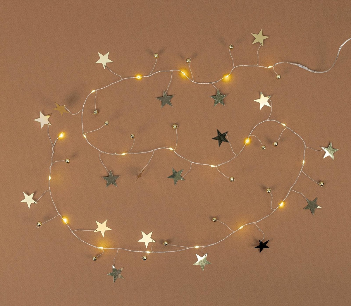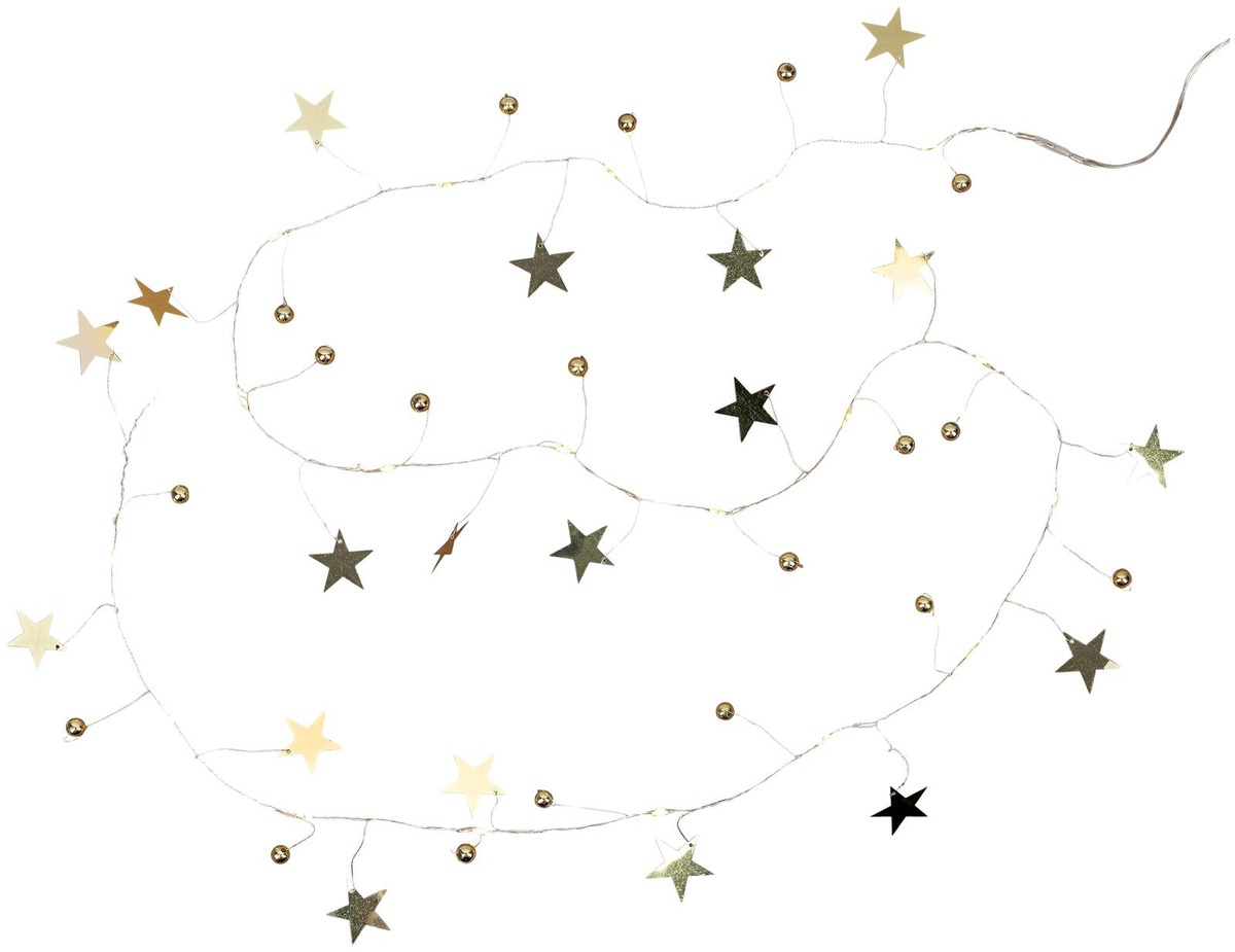 Taipuisa valolanka, Tiuku Star, jossa koristeena pieniä kelloja ja tähtiä. Led 20 kpl lämmin valkoinen, ei vaihdettava. Valo-osan pituus 1,50 m. Paristot 2 x AA, ei sisälly. Sisältää ajastimen. Sisäkäyttöön.