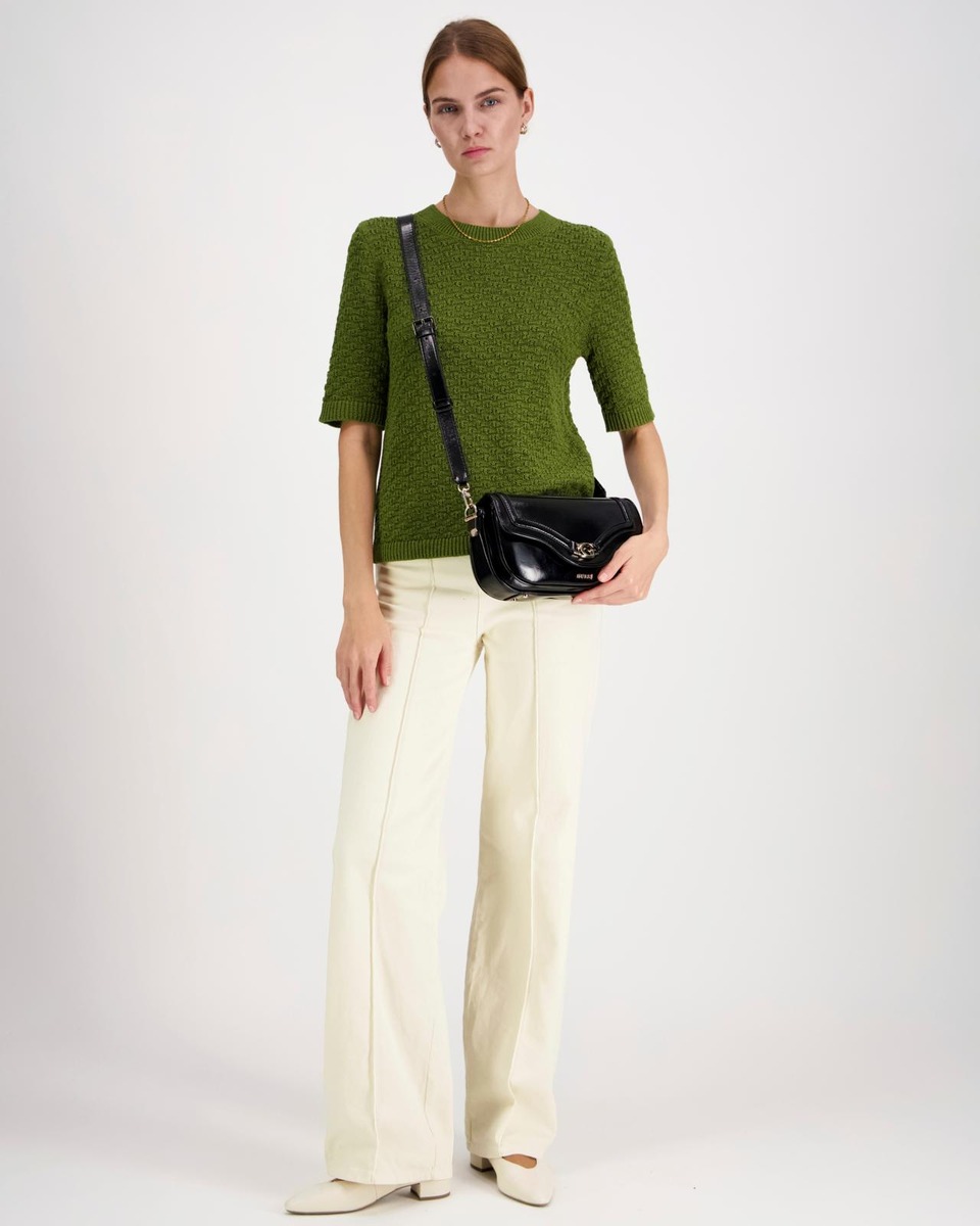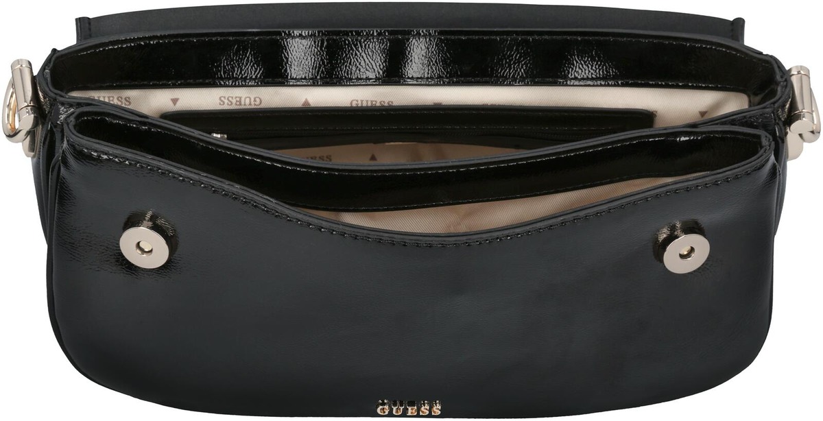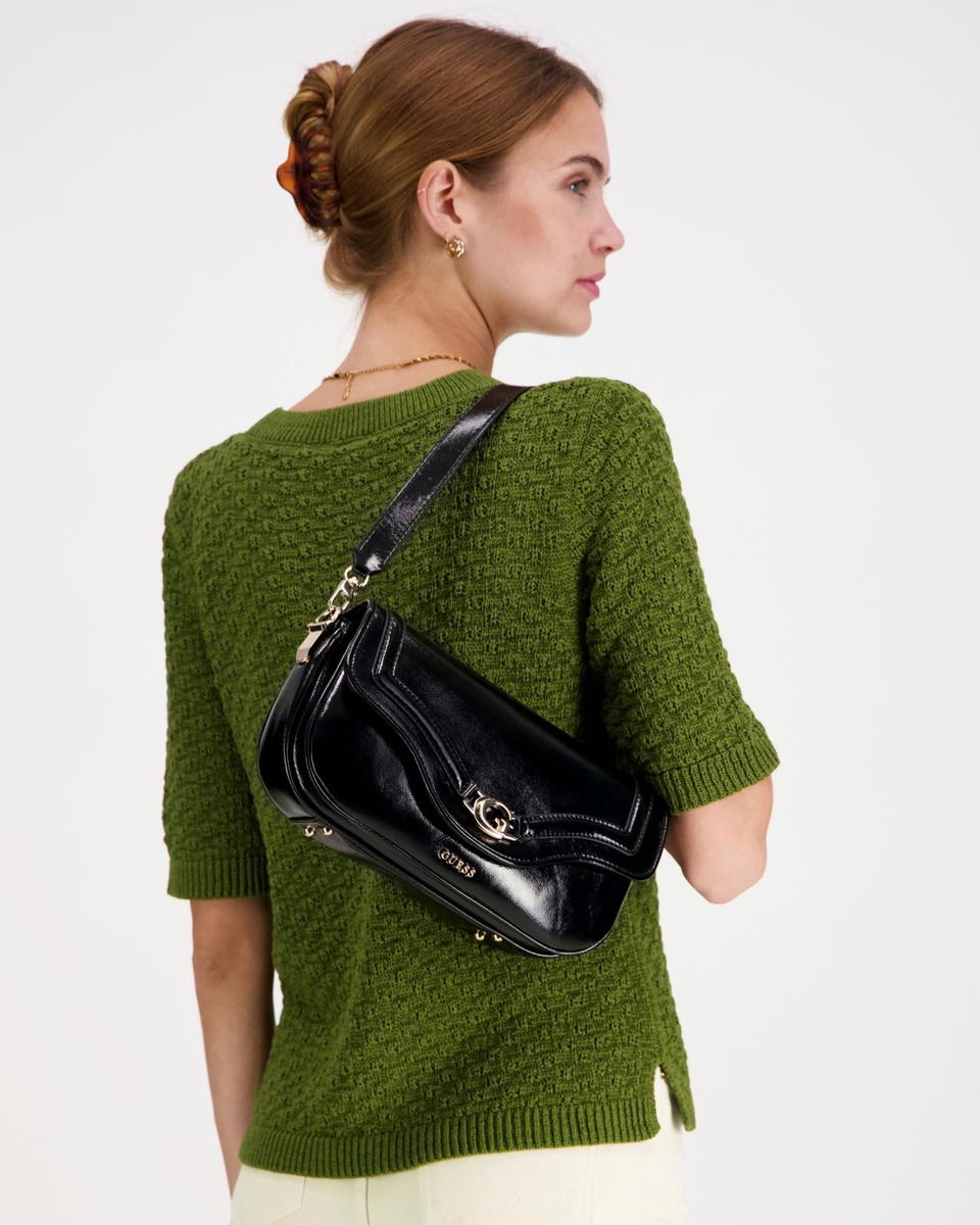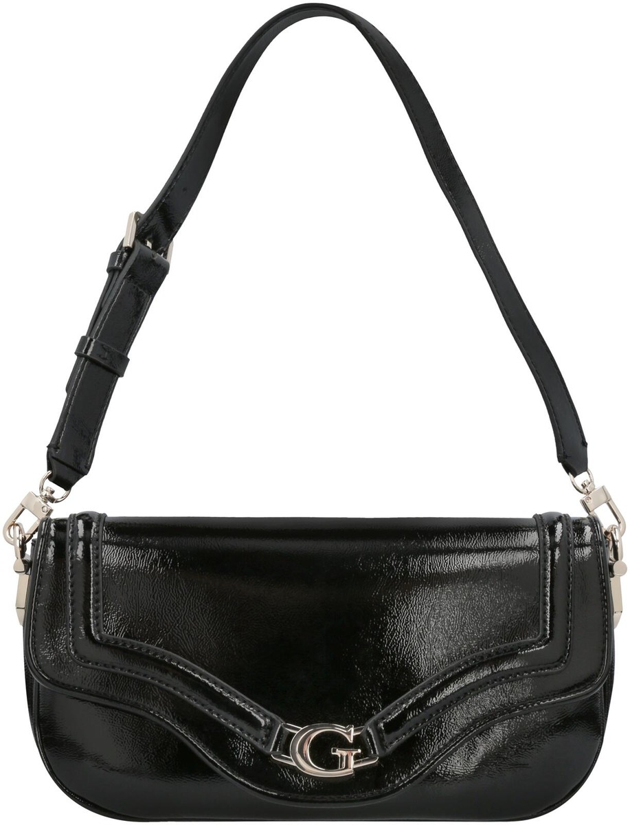 Kiiltävä ja kovapintainen olkalaukku irroitettavalla kantohihnalla. Laukun läppä aukeaa kahdella painonapilla ja sisältä löytyy kaksi avotaskua. Lisäksi laukun takapuolella on pieni vetoketjutasku.