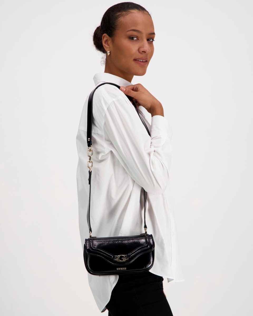 Kiiltäväpintainen pieni crossbody pitkällä kantohihnalla. Laukun läppä suljetaan painonapeilla ja sisältä löytyy kaksi avotaskua.