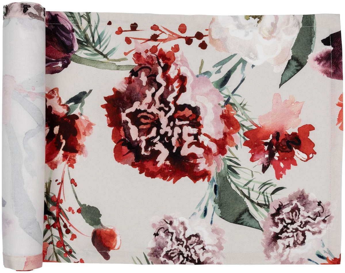 Pohjoinen joulu. Vuoden kukkivin ajankohta. Jokaisen joulu on erilainen. Se rakentuu kuin rennosti rönsyilevä joulukukkakimppu, jossa erikokoiset ja väriset kukat muodostavat kauniin kokonaisuuden. Samoin joulu kootaan paloista lapsuuden jouluista, vuosien varrella kerätyistä koristeista ja omista, aivan uusistakin perinteistä. Kimara-kuosia suunnitellessaan Minna Niskakangas palasi omiin joulumuistoihinsa. Niihin liittyy erityisen voimakkaasti lämpöä tuovat joulutekstiilit, joilla koti puetaan juhlaan. Vahvat värit tuntuvat hyvältä pimeään vuodenaikaan. Kimara kunnioittaa perinteitä, mutta tuo ne sulavasti tähän päivään. Kimara-akryylipinnoitettu kaitaliina on käytännöllinen valinta ruokapöytään, sillä se hylkii likaa ja on helppo pyyhkiä puhtaaksi. Kaitaliinan koko on 45x160 cm ja se materiaali on 100 % akryylipinnoitettua puuvillaa. Kestää konepesun varovaisella ohjelmalla 40 asteessa.