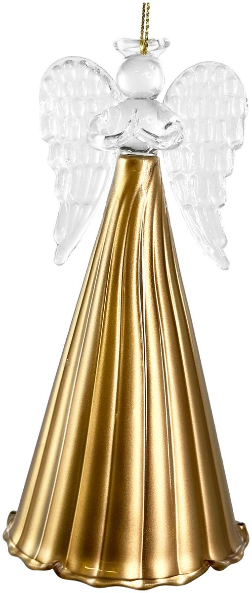 Lasisen enkelin yläosa on kirkasta lasia ja helmaosa kullanvärinen. Ripustettava, korkeus 15 cm
