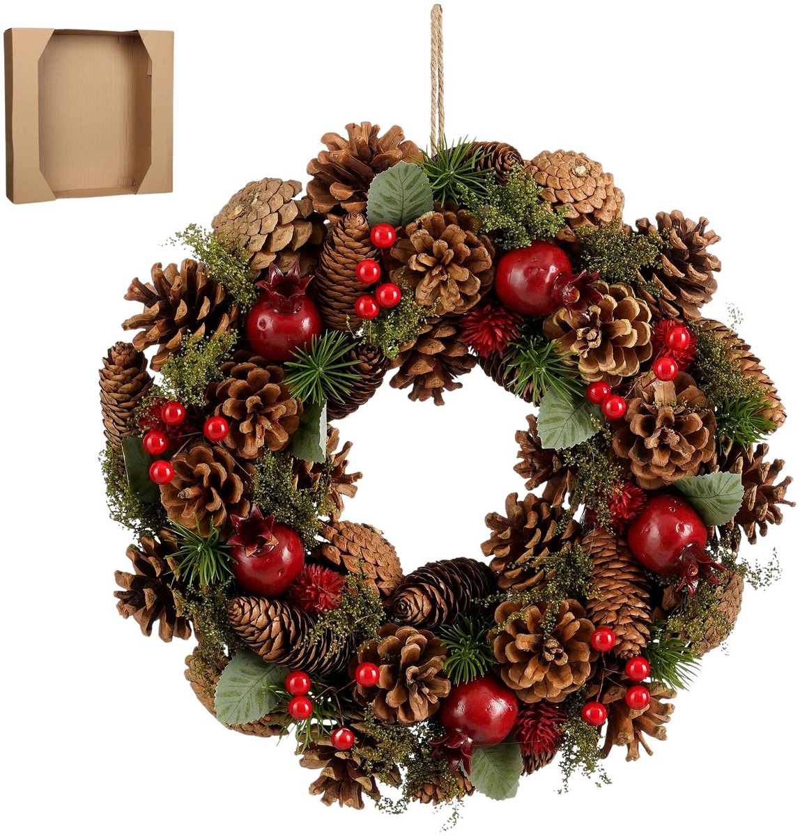 Punaisilla marjoilla ja kävyillä koristeltu kranssi. Vain sisäkäyttöön.