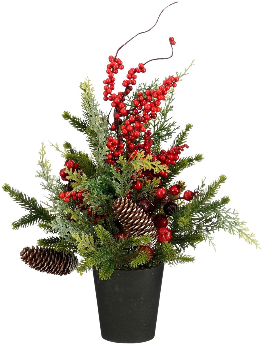 Koristekuusi ruukussa, punaisia marjoja ja käpyjä.
