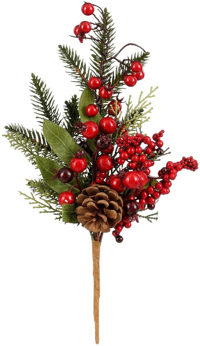 Sisustusoksa, jossa havuja ja punaisia marjoja.