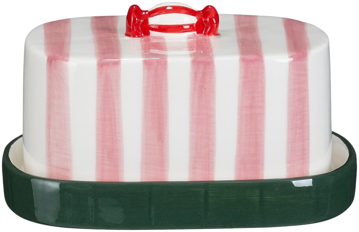 Keraaminen pinkki-valkoraitainen kannellinen voiastia.