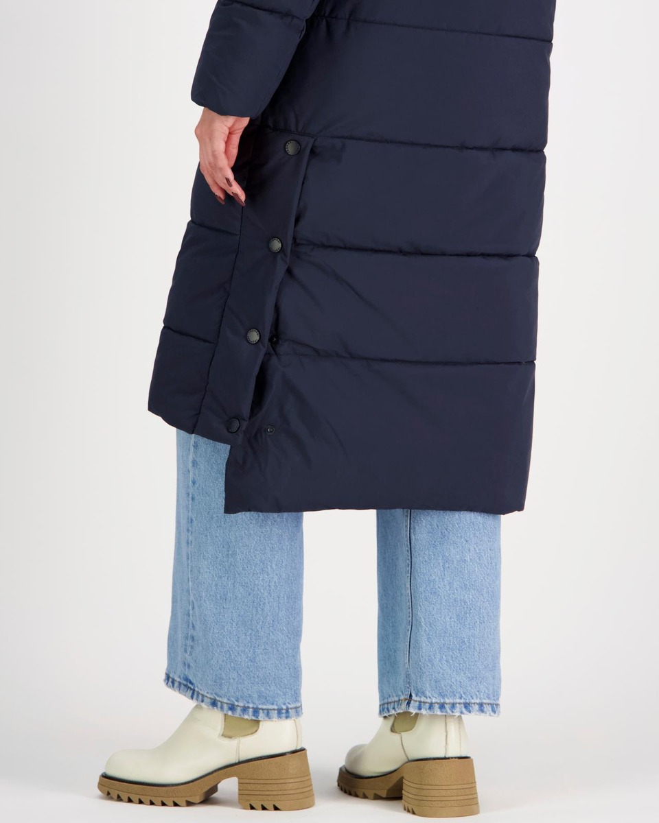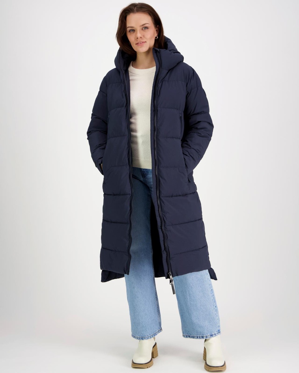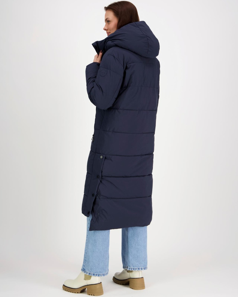 Ragwearin toppatakki, muodikkaassa pitkässä toppatakissa on erittäin lämmin vanutäyte ja takki on veden- ja tuulenpitävä. Vesipilariarvo 8000 mm ja hengittävyysarvo 5000 mm. Takissa on kiinteä huppu ja vetoketjulla suljettava povitasku. Takin helmassa on napeilla kiinnitettävät ja avattavat sivuhalkiot. Takissa on reilu mitoitus ja vetoketjuilla suljettavat sivutaskut. Takissa on huolitellut yksityiskohdat ja hihassa pieni logomerkki. Takki on konepestävä. Selän pituus koossa S 118 cm. Kaikki Ragwearin tuotteet ovat vegaanisia ja PETA:n hyväksymiä.