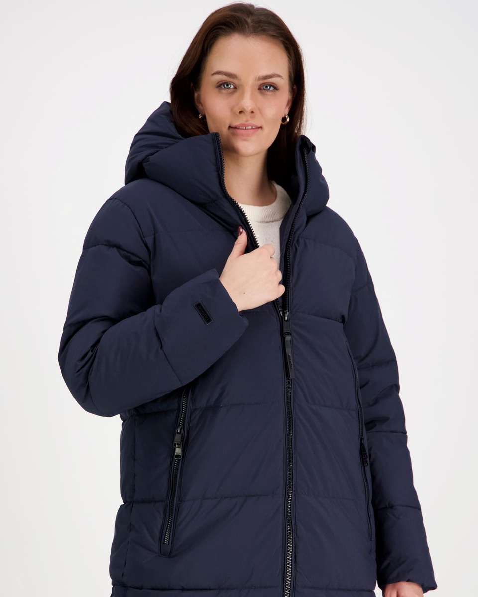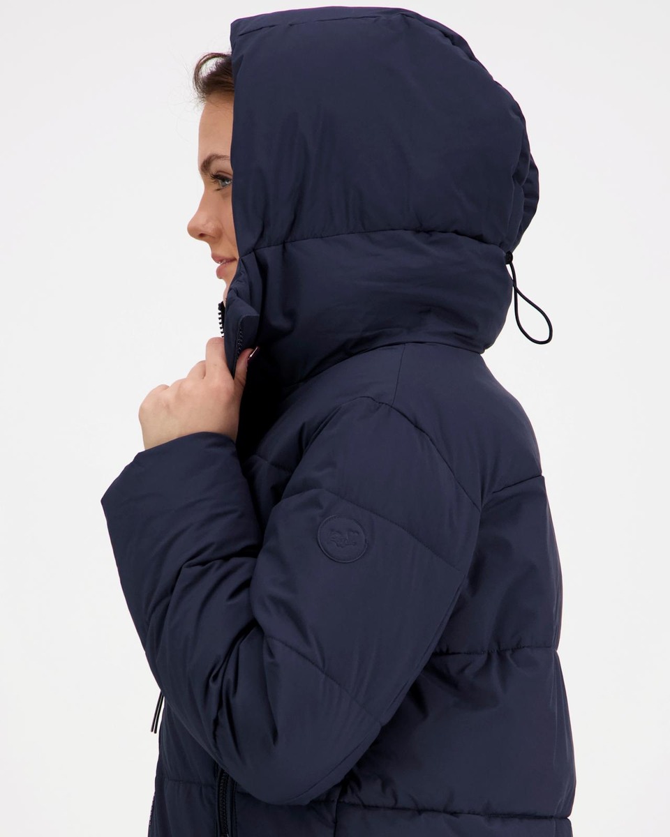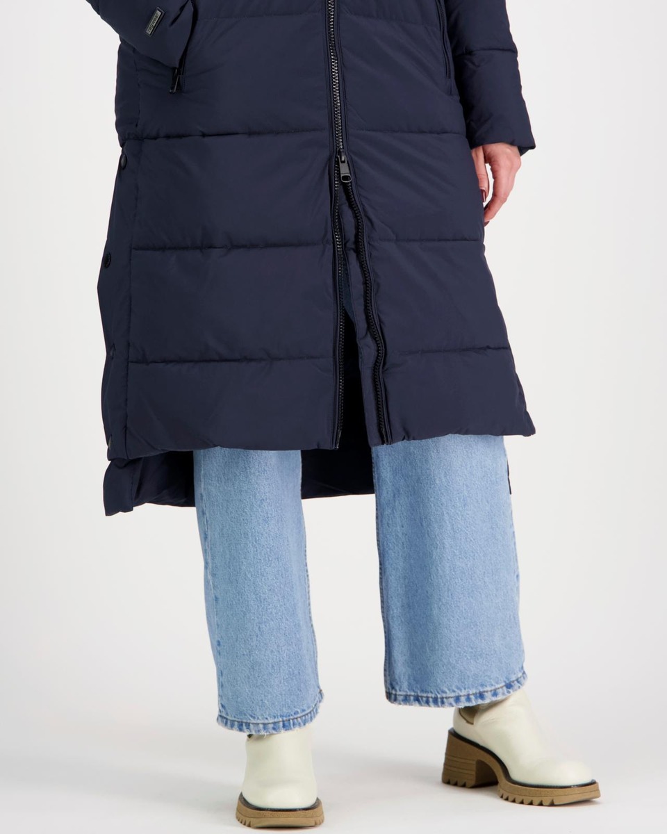 Ragwearin toppatakki, muodikkaassa pitkässä toppatakissa on erittäin lämmin vanutäyte ja takki on veden- ja tuulenpitävä. Vesipilariarvo 8000 mm ja hengittävyysarvo 5000 mm. Takissa on kiinteä huppu ja vetoketjulla suljettava povitasku. Takin helmassa on napeilla kiinnitettävät ja avattavat sivuhalkiot. Takissa on reilu mitoitus ja vetoketjuilla suljettavat sivutaskut. Takissa on huolitellut yksityiskohdat ja hihassa pieni logomerkki. Takki on konepestävä. Selän pituus koossa S 118 cm. Kaikki Ragwearin tuotteet ovat vegaanisia ja PETA:n hyväksymiä.
