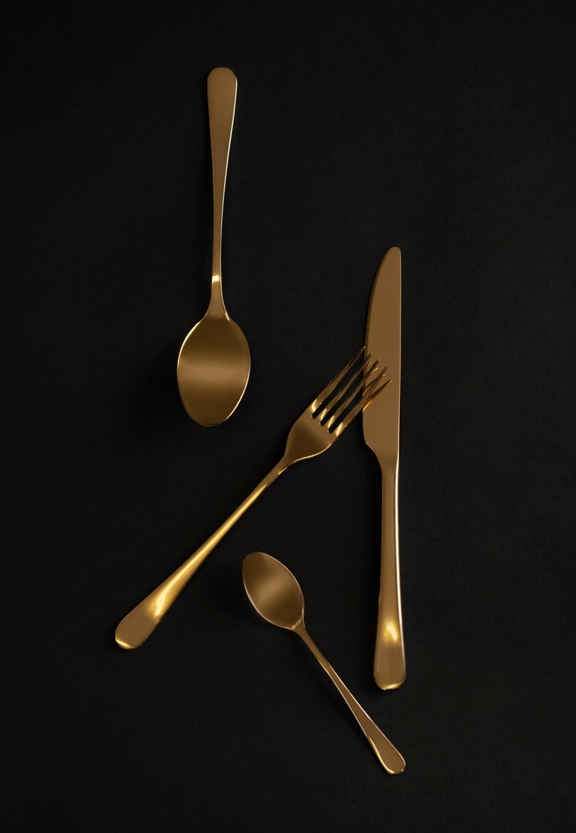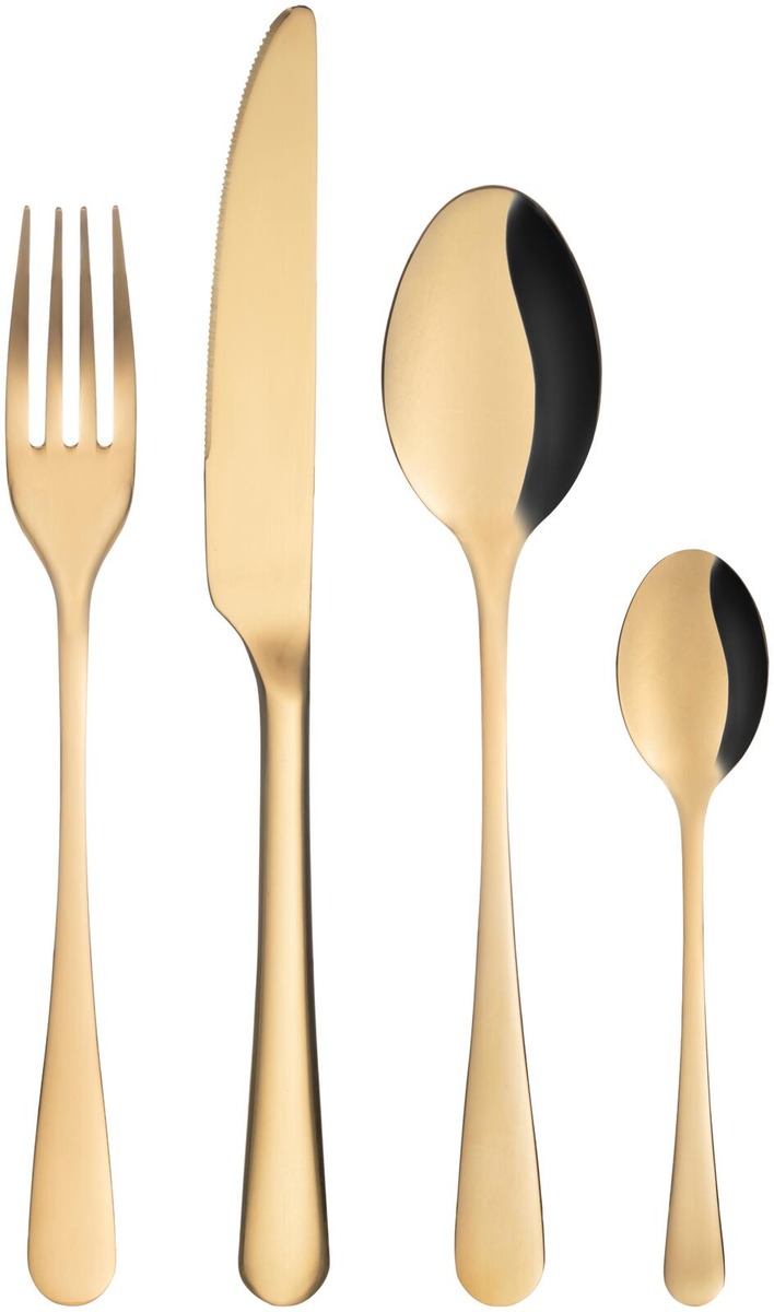 Tyylikkäät aterimet ovat oleellinen osa kattausta. Kullanväriset aterimet ovat jännittävä värivaihtoehto kattaukseen, täydelliset kun tahdot yllättää. Ruostumaton teräs on pinnoitettu kestävällä PVD-pinnoitteella. Setti sisältää 4 veistä, 4 haarukkaa, 4 lusikkaa ja 4 pikkulusikkaa Käsinpesu.