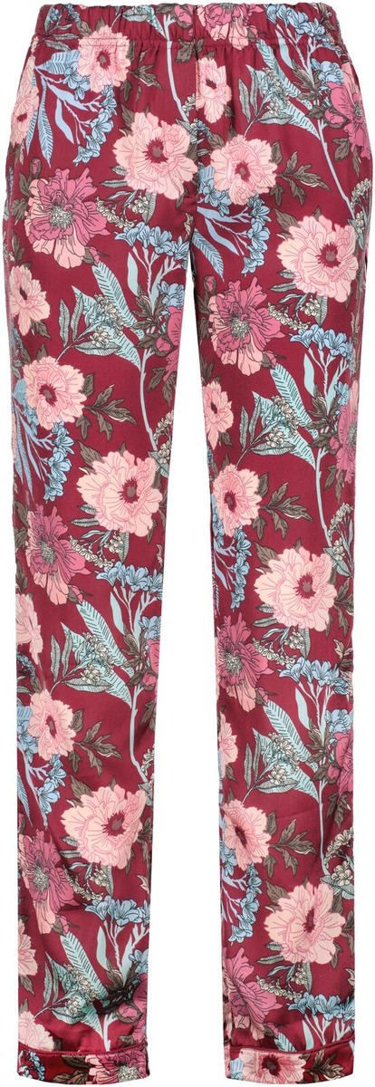 Pitkähihainen pyjama, polyester satiinia, kukkakuosi, kaulus ja napit edessä, housuissa elastinen vyötärönauha
