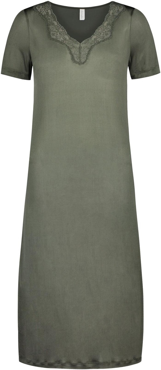 Lyhythihainen yöpaita, silkkitrikoota, V-kaula-aukossa leveä pitsi, pituus 110 cm