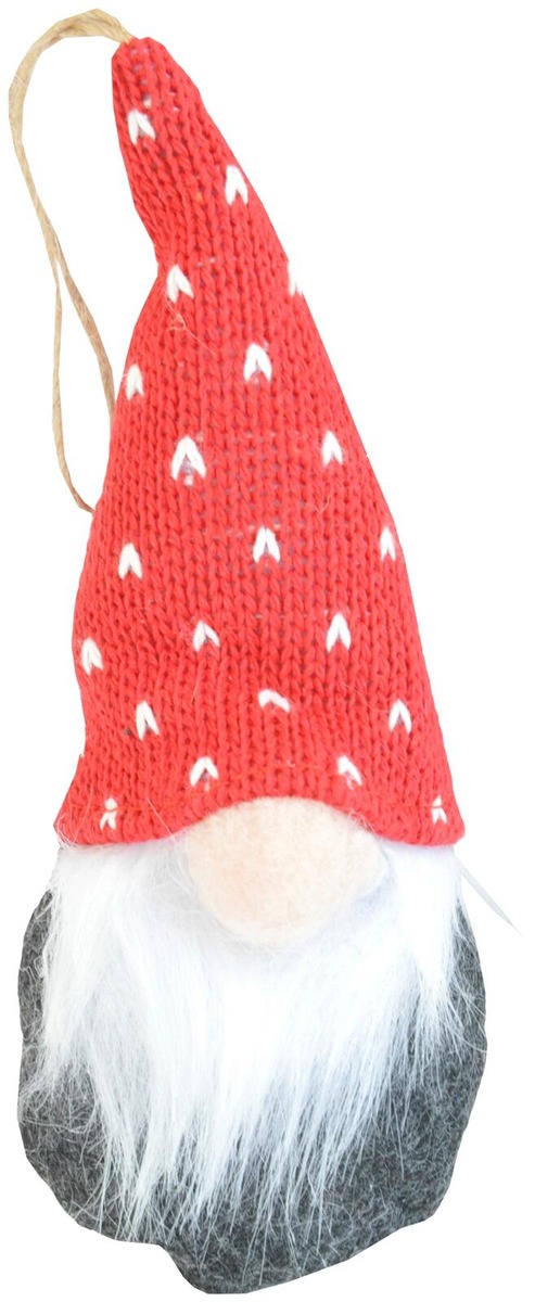 Pieni huopakankainen tonttukoriste, minkä saa ripustettua esimerkiksi joulukuuseen tai ovenkahvaa. Korkeus 15 cm.