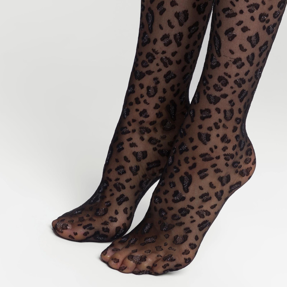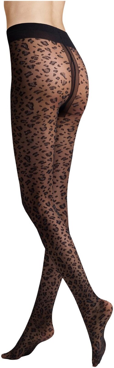 Läpikuultavat 20den sukkahousut leopardikuvioinnilla. Juhlavat lurex somisteet. Rajaton housuosa. Tasosauma ja puuvillahaarakiila.