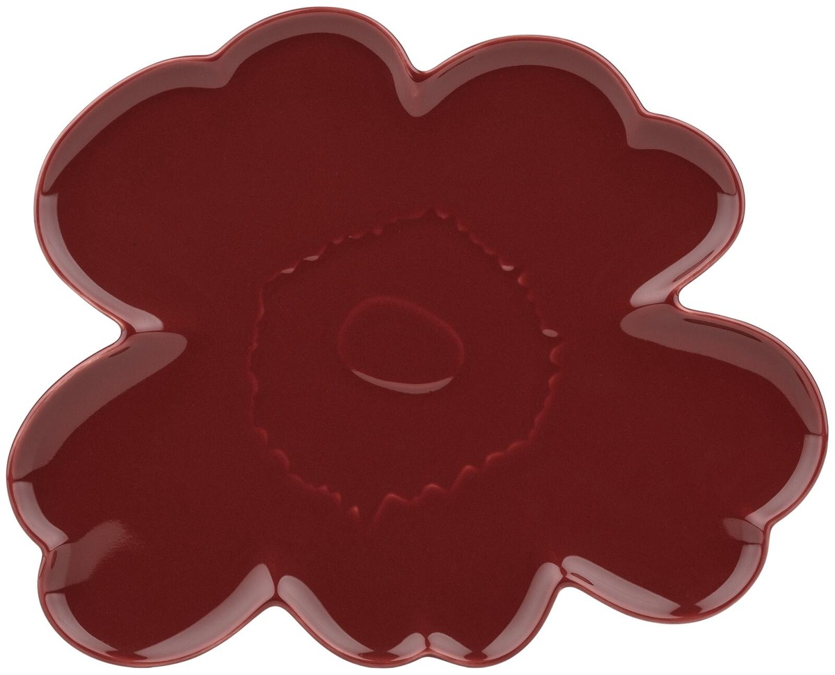 Unikko-kukan mallinen suuri lautanen on valmistettu keramiikasta viininpunaisella lasitteella. Värillinen lasite antaa tuotteelle eläväisen värin. Suosittelemme lautaselle käsinpesua. Vaikka tuote on konepesunkestävä, sen ainutlaatuisesta muodosta johtuen se on herkkä muiden astioiden aiheuttamille mahdollisille kolhuille. Tuote pakataan Logo-kuosiseen laatikkoon.Luovuutta ja rohkeutta symboloiva Unikko syntyi aikana, jolloin Marimekon kuviomaailmaan ei juuri kuulunut kukkia. Maija Isolaa kukka-aihe kuitenkin kiinnosti, ja hän päätti suunnitella kokonaisen sarjan uudenlaisia vahvoja kukkakuoseja.