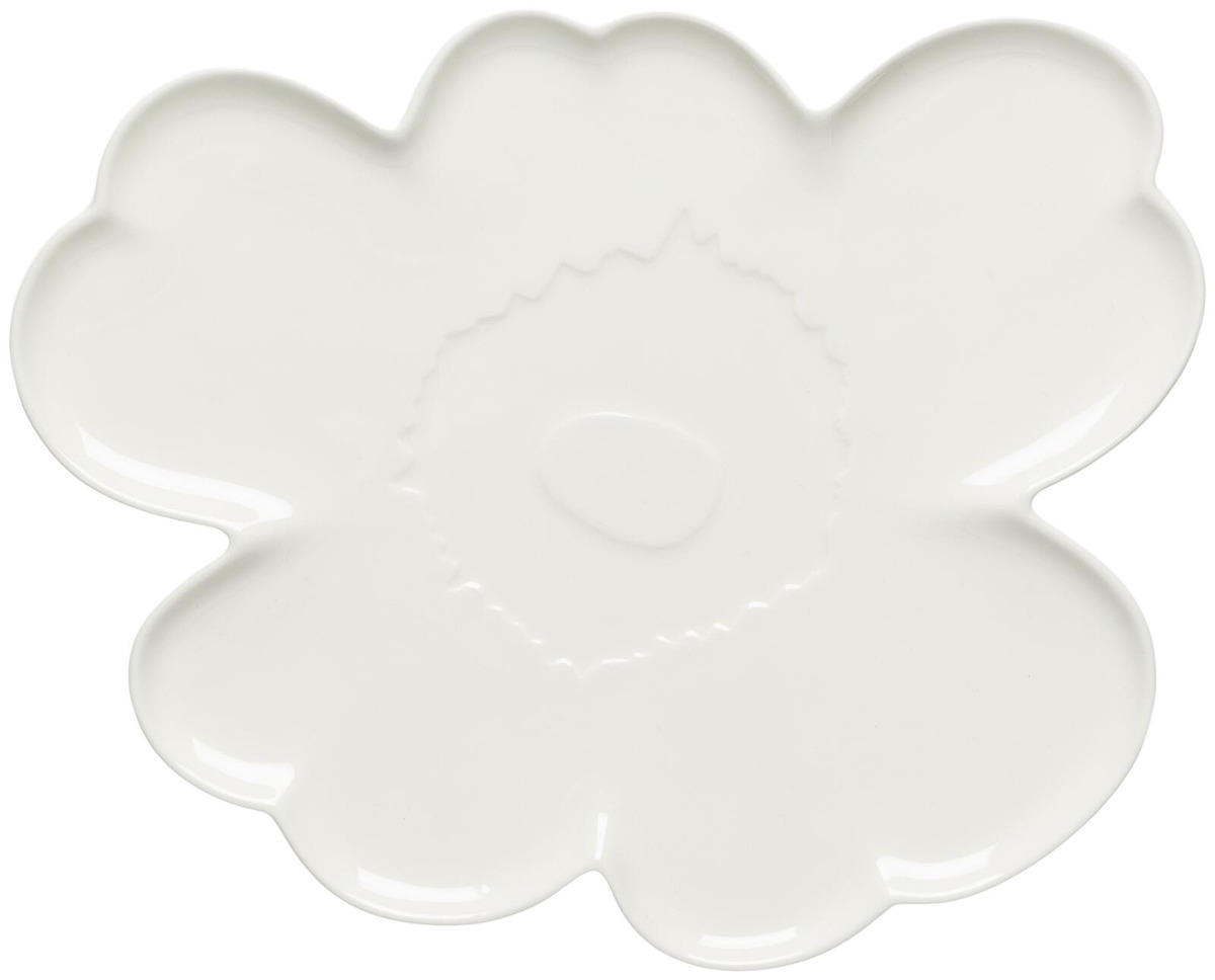 Unikko-kukan mallinen tarjoilulautanen on valmistettu valkoisesta keramiikasta. Suosittelemme lautaselle käsinpesua. Vaikka tuote on konepesunkestävä, sen ainutlaatuisesta muodosta johtuen se on herkkä muiden astioiden aiheuttamille mahdollisille kolhuille. Tuote pakataan laatikkoon. Luovuutta ja rohkeutta symboloiva Unikko syntyi aikana, jolloin Marimekon kuviomaailmaan ei juuri kuulunut kukkia. Maija Isolaa kukka-aihe kuitenkin kiinnosti, ja hän päätti suunnitella kokonaisen sarjan uudenlaisia vahvoja kukkakuoseja.