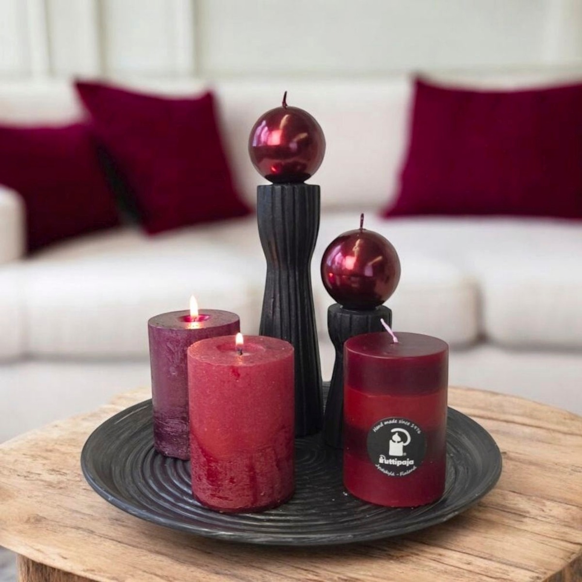 Loihdi näyttäviä kynttiläasetelmia yhdistämällä erivärisiä, -kokoisia tai -muotoisia kynttilöitä. Läpivärjätty pöytäkynttilä palaakin erinomaisesti erilaisissa kynttiläasetelmissa, ulko- tai lasilyhdyissä.