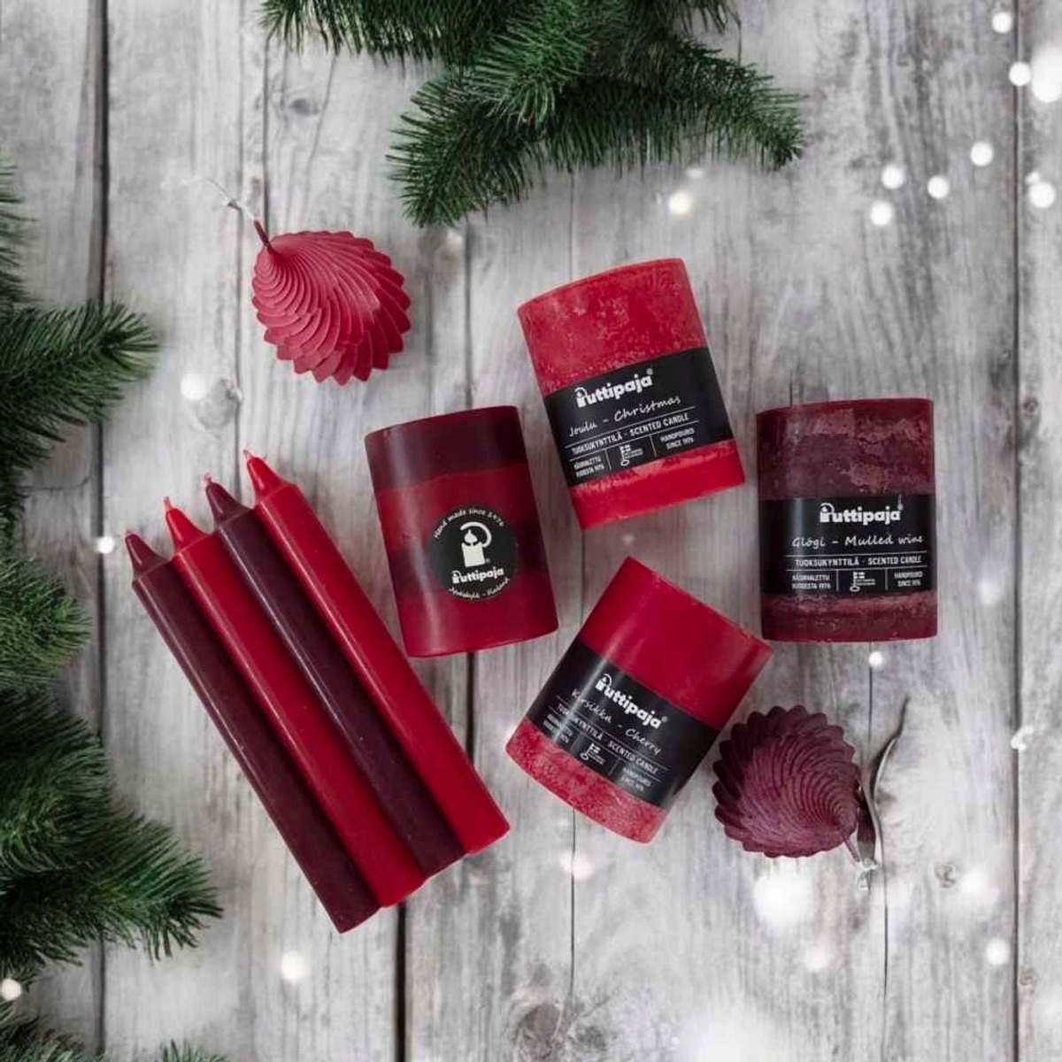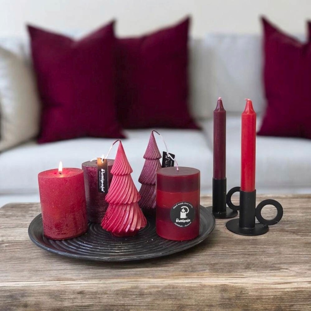 Täydellinen joulukynttilä, jossa punaisen ja viinipunaiset raidat leikkivät keskenään. Perinteisiä sävyjä uudemmalla twistillä.