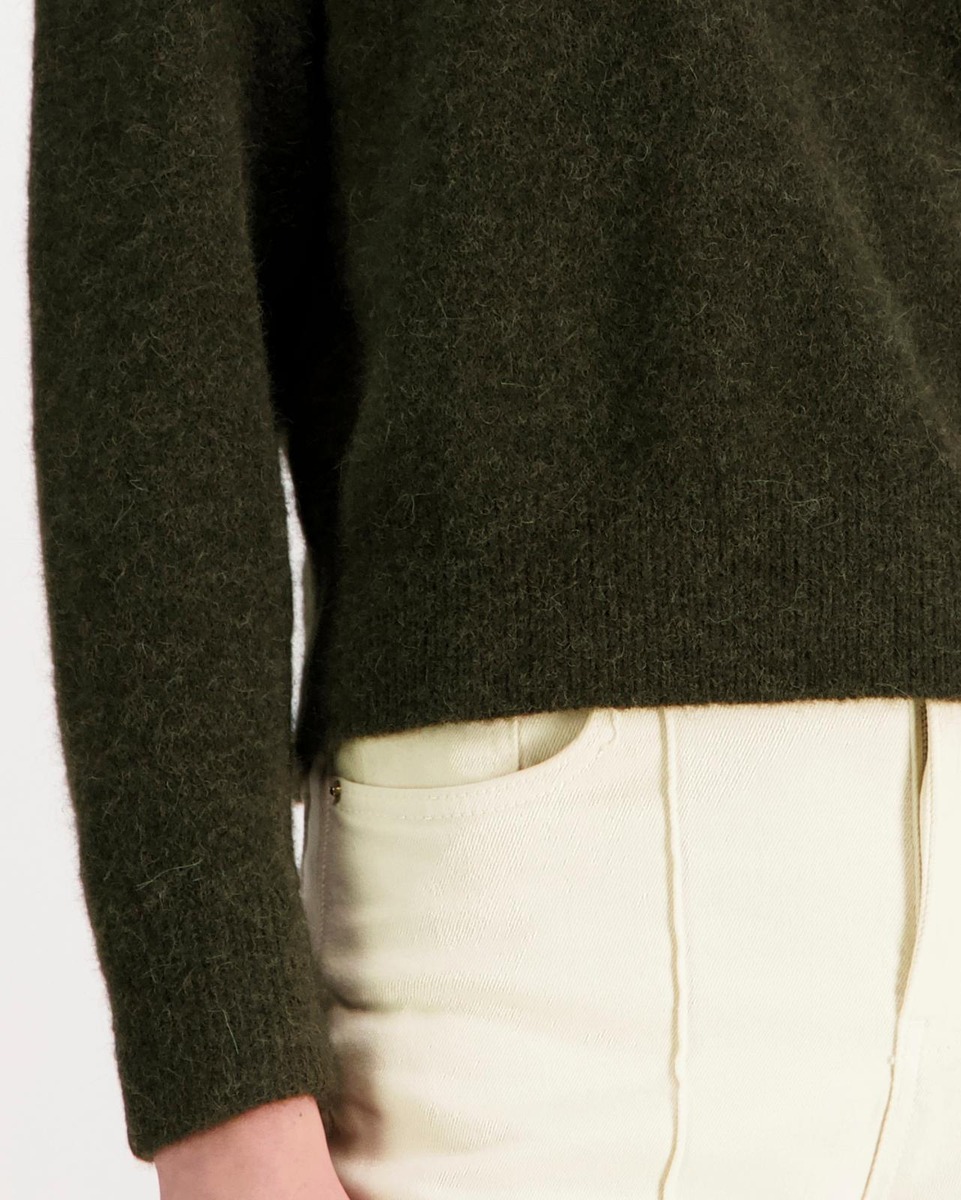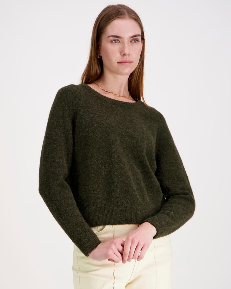 Samsøe Samsøen alpakka-merinovillasekoitteinen tummanvihreä neule. Pyöreä pääntie ja raglanhiha, mallina lyhyehkö.