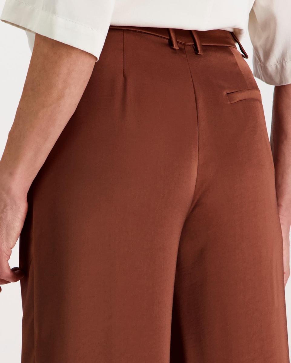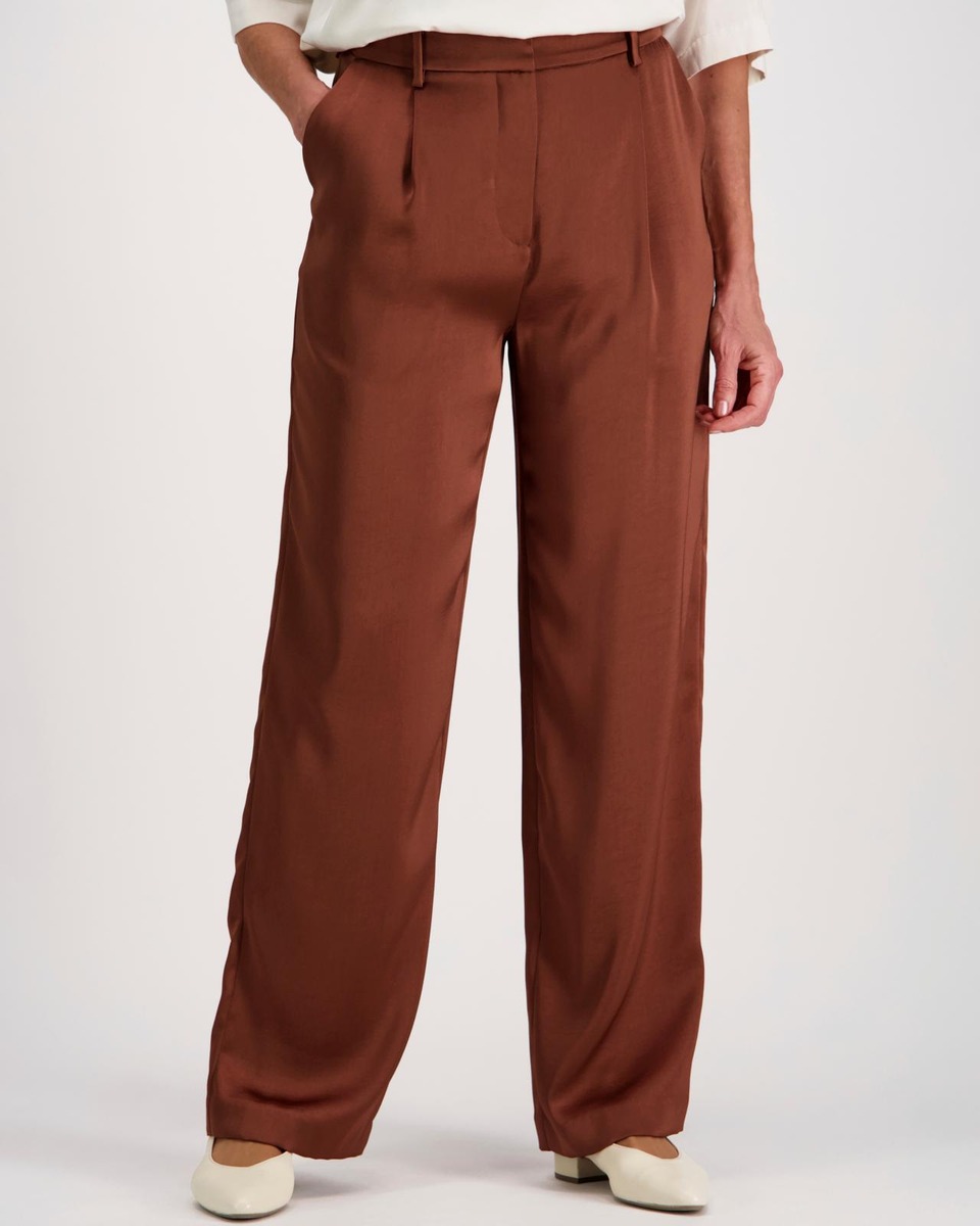 Samsøe Samsøen satiiniset, normaalivyötäröiset housut, joissa on tavallinen istuvuus. Edessä näkymätön hakanen ja vetoketju. Edessä sivutaskut ja takana yksittäinen päälleommeltu tasku. Edessä yksittäiset laskokset. Vyölenkit. Päämateriaali on 100 % kierrätettyä polyesteriä.
