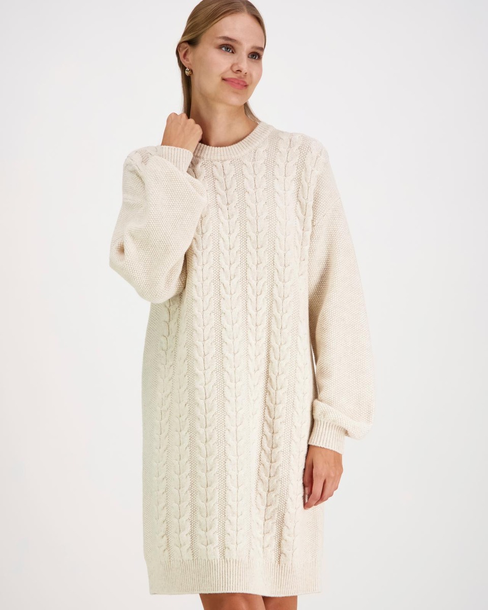 Naisten muhkea Palmikko-neulemekko. Neulemekossa on pyöreä pääntie, pudotettu olkalinja ja täyspitkät hihat. Pääntiellä, helmassa ja hihansuissa on resori. Neulemekossa on kaunis neulottu palmikkokuvio ja sen pituus koossa M on noin 88 cm. Neulos on pehmeän ja miellyttävän tuntuista villa-polyamidi sekoitetta. Tuotteen valmistuksessa on käytetty sertifioitua villaa.
