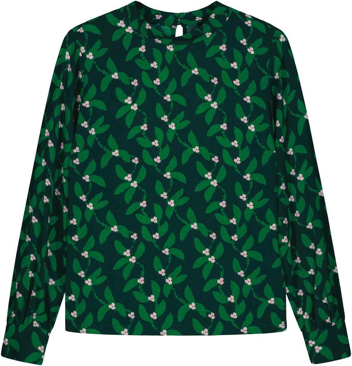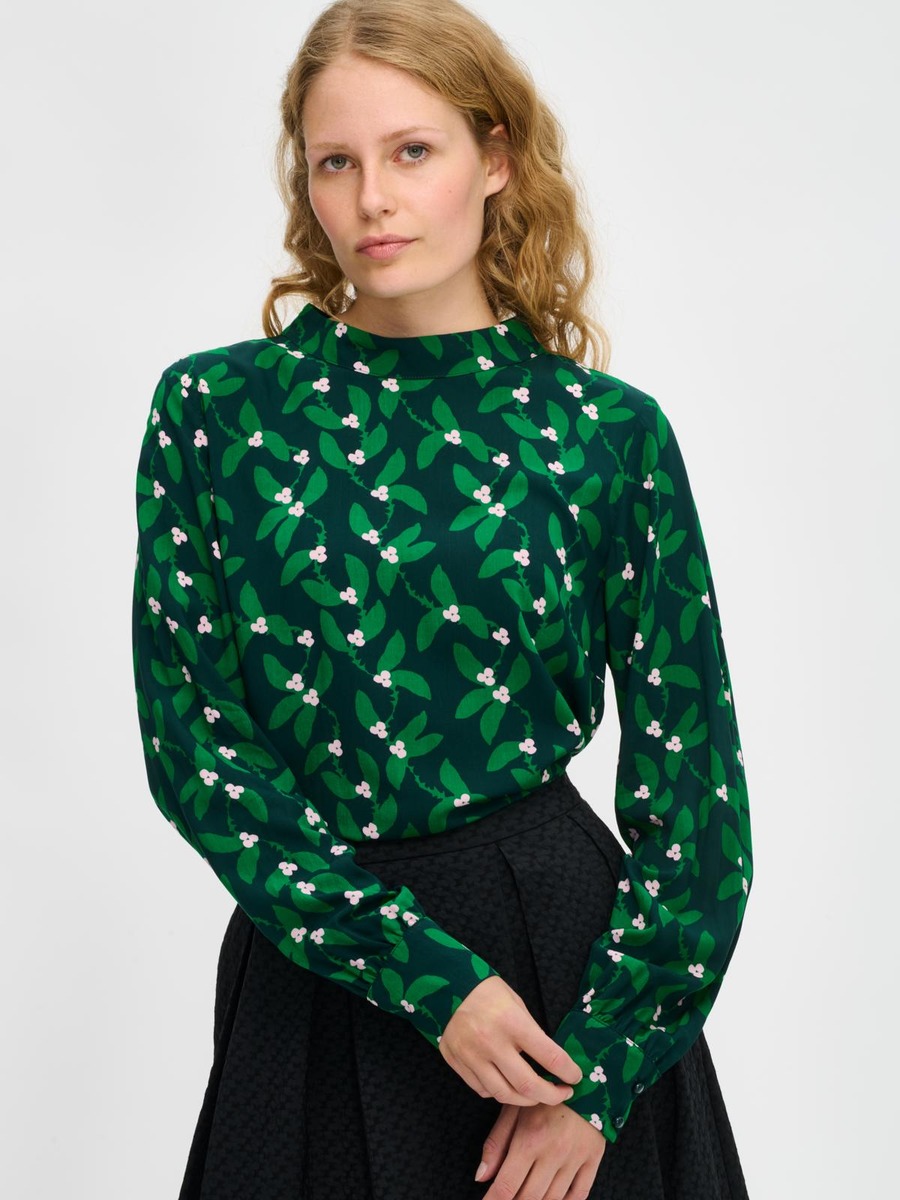 Naisten kuosillinen Vieno-pusero. Puserossa on pieni pystykaulus, edessä rintamuotolaskokset ja niskassa halkio napeilla. Puserossa on täyspitkät hihat, joiden hihansuissa on nappikalvosimet. Puseron pituus koossa 38 on noin 64 cm. Kauniisti laskeutuvan puseron materiaali on laadukasta ja miellyttävän tuntuista viskoosikangasta. Materiaalille on ominaista 3-5% kutistuminen ensimmäisessä pesussa.