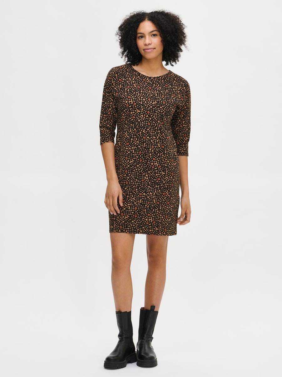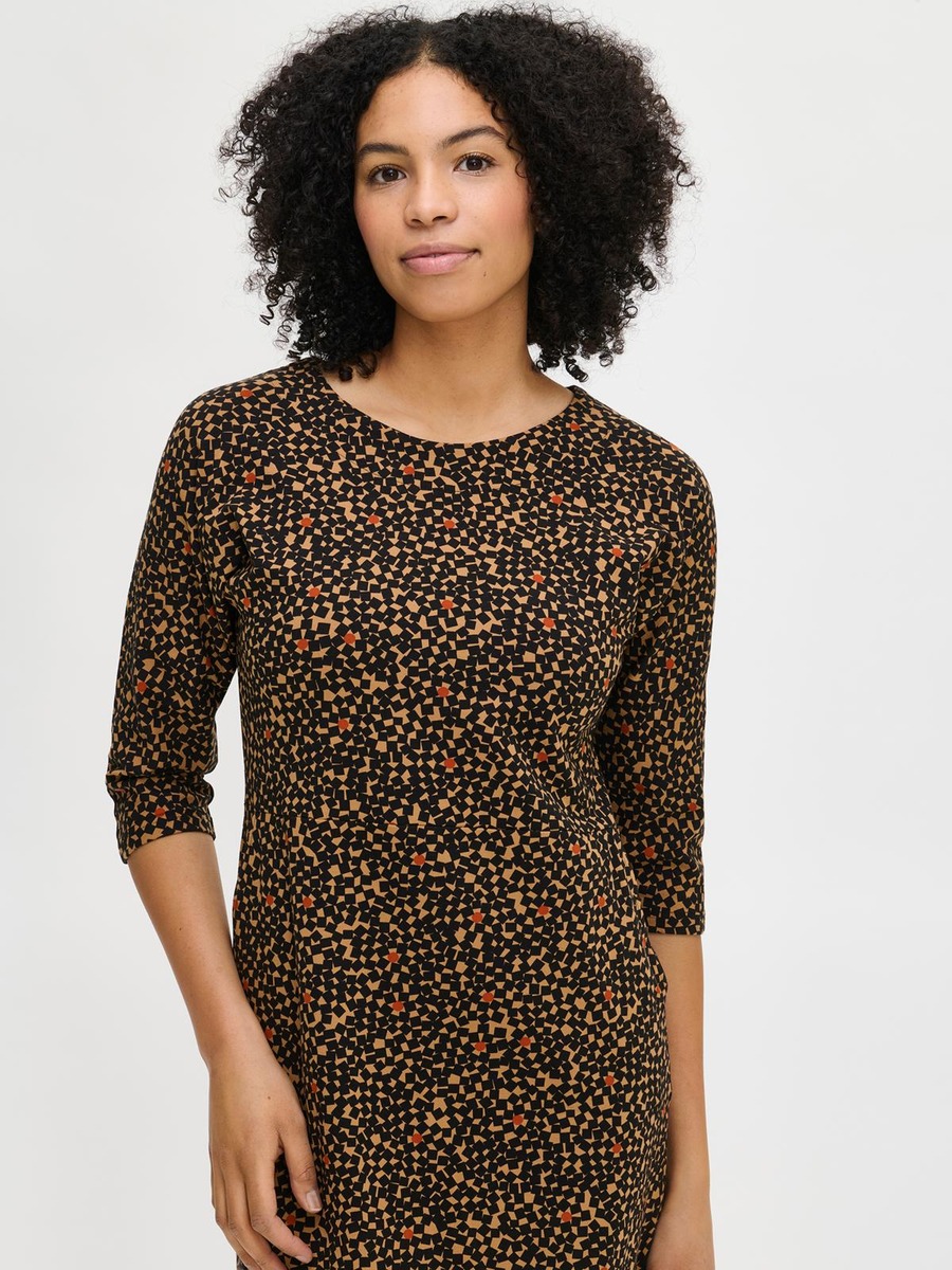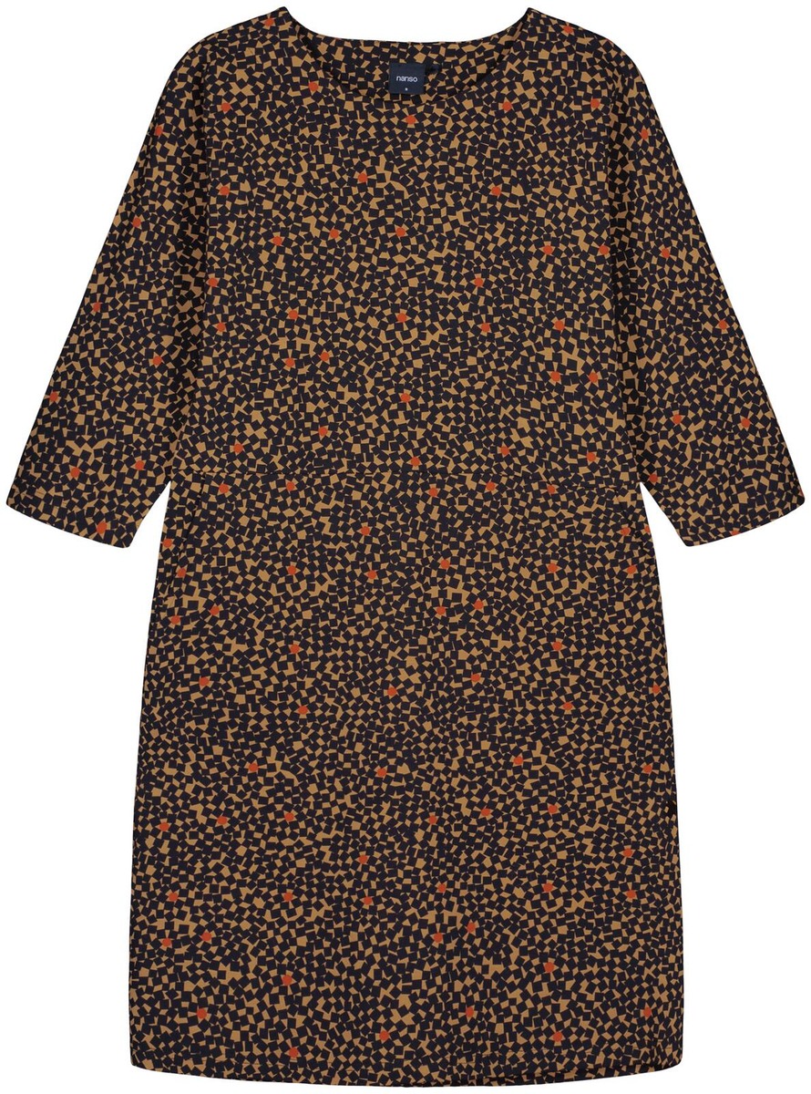 Naisten kuosillinen Polku-mekko. Suoralinjaisessa mekossa on 3/4-pituiset hihansuista kapeahkot kimonohihat ja alavaralla viimeistelty ovaali pääntie. Mekon vyötäröllä on edessä poikkisauma ja sivuissa taskut. Mekon pituus koossa M on noin 95 cm. Materiaali on miellyttävän tuntuista ja helppohoitoista puuvilla-elastaani-neulosta.