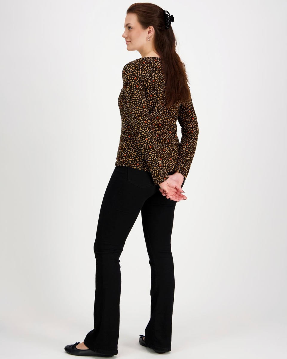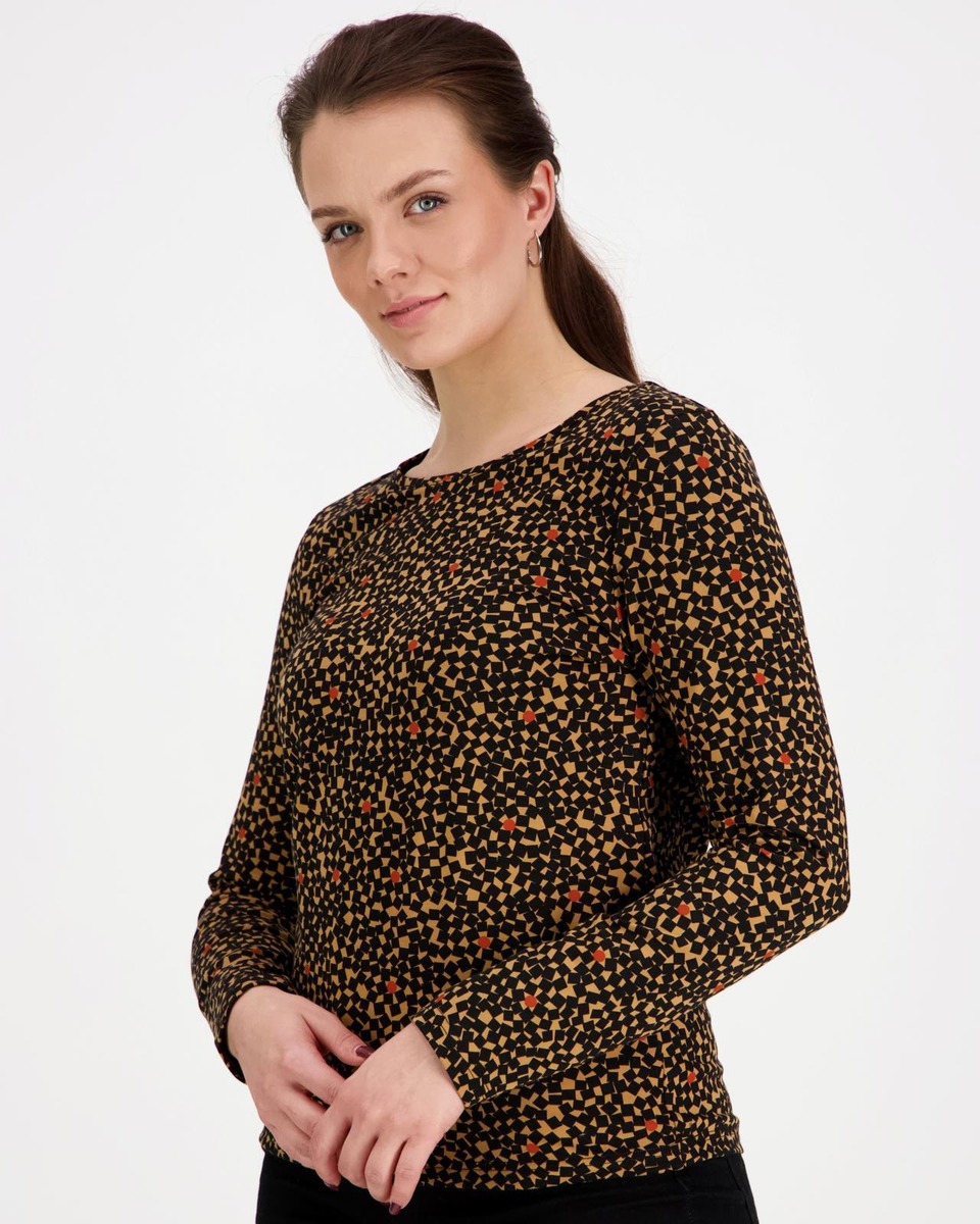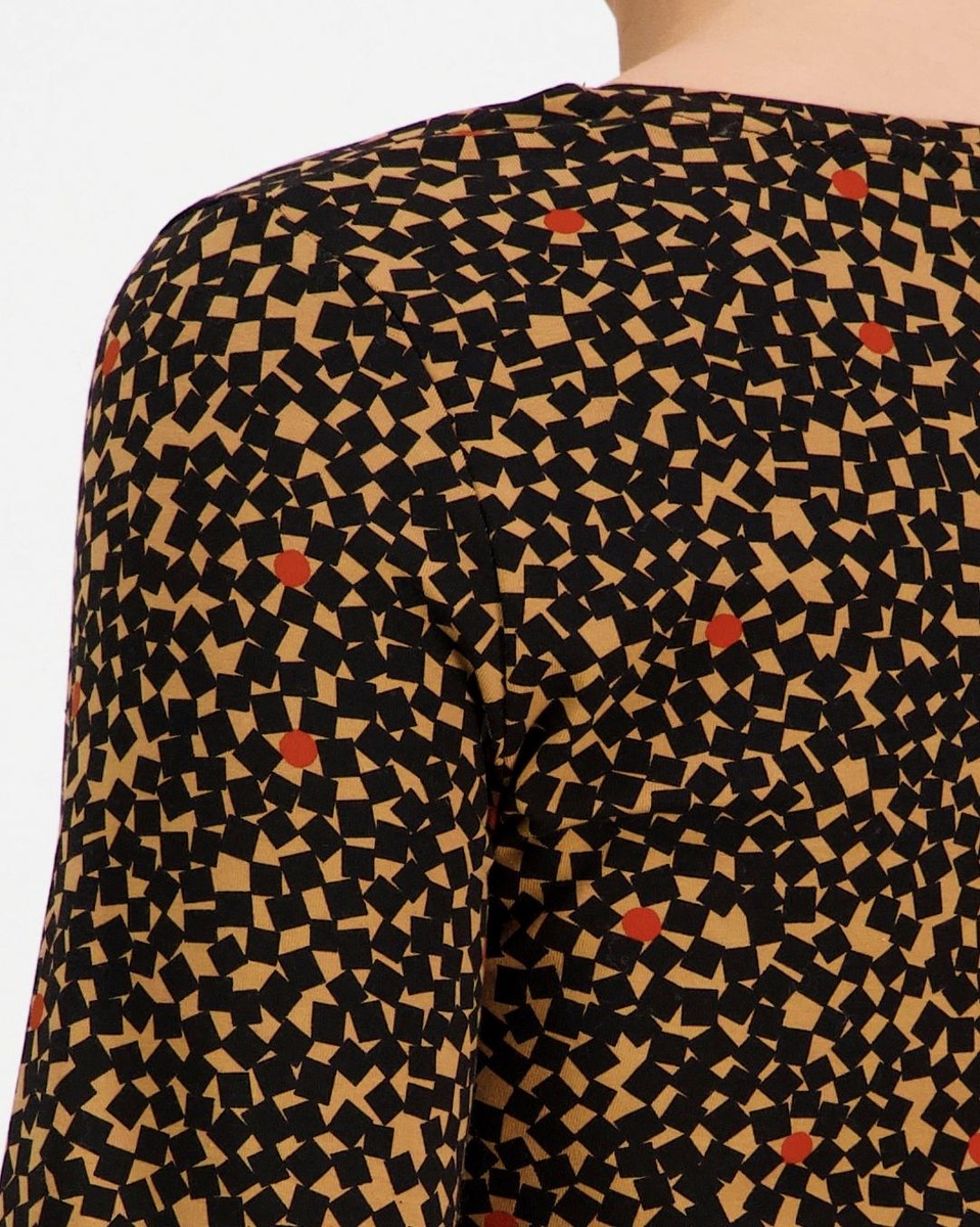 Naisten kuosillinen Polku-pusero. Puseron pyöreä pääntie on viimeistelty alavaralla, helmassa on halkiot ja hihat ovat täyspitkät. Puseron pituus koossa M on noin 65 cm. Materiaali on miellyttävän tuntuista ja helppohoitoista puuvilla-elastaani-neulosta.