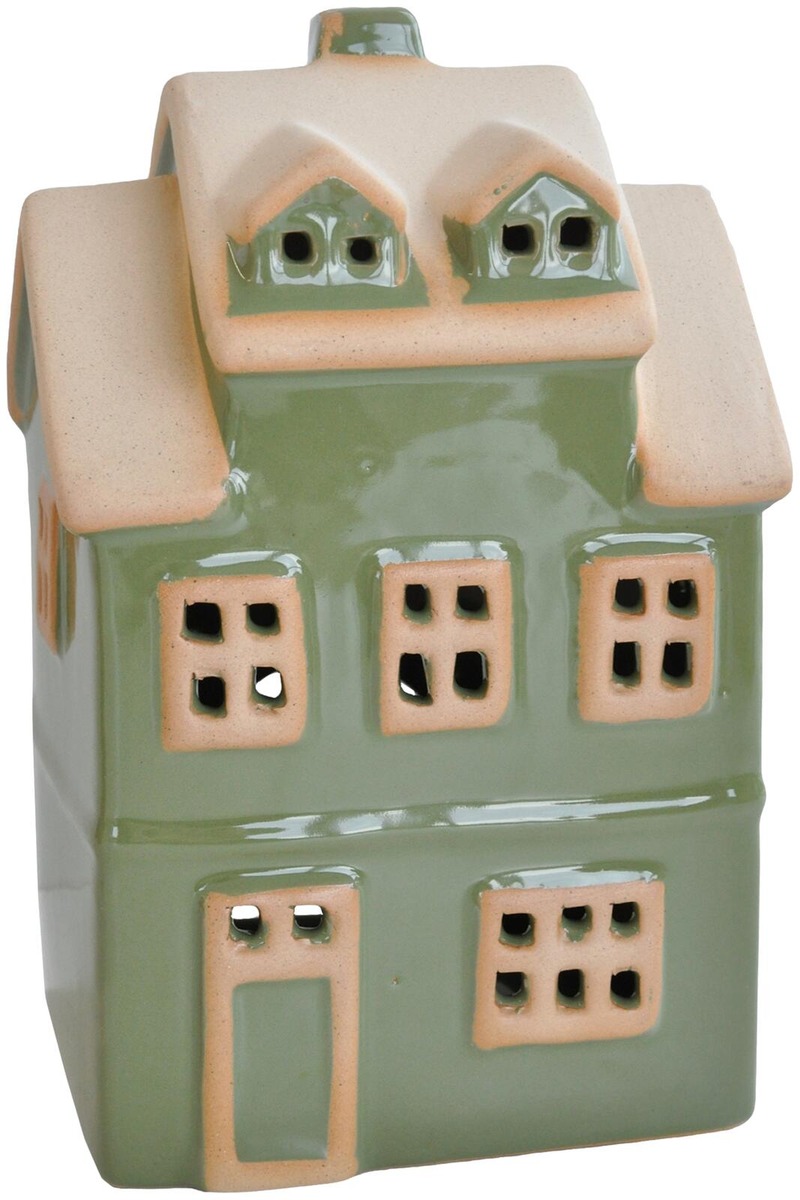 Vihreä keraaminen talolyhty, jossa beige katto ja ikkunat. Sopii lämpö- tai ledkynttilälle. Yhdistelemällä erivärisiä/kokoisia lyhtyjä saa hauskan ja näyttävän kylän rakennettua.