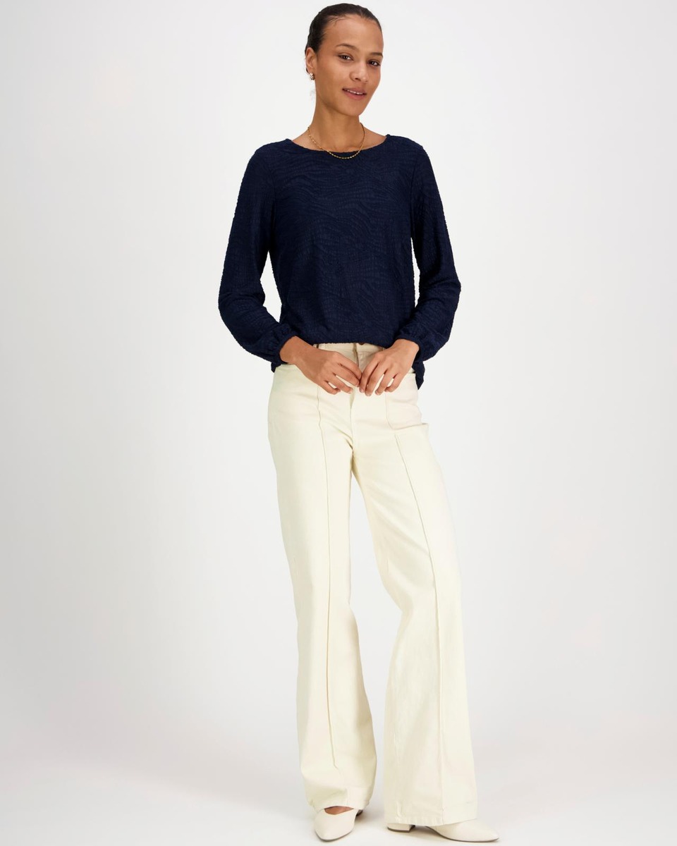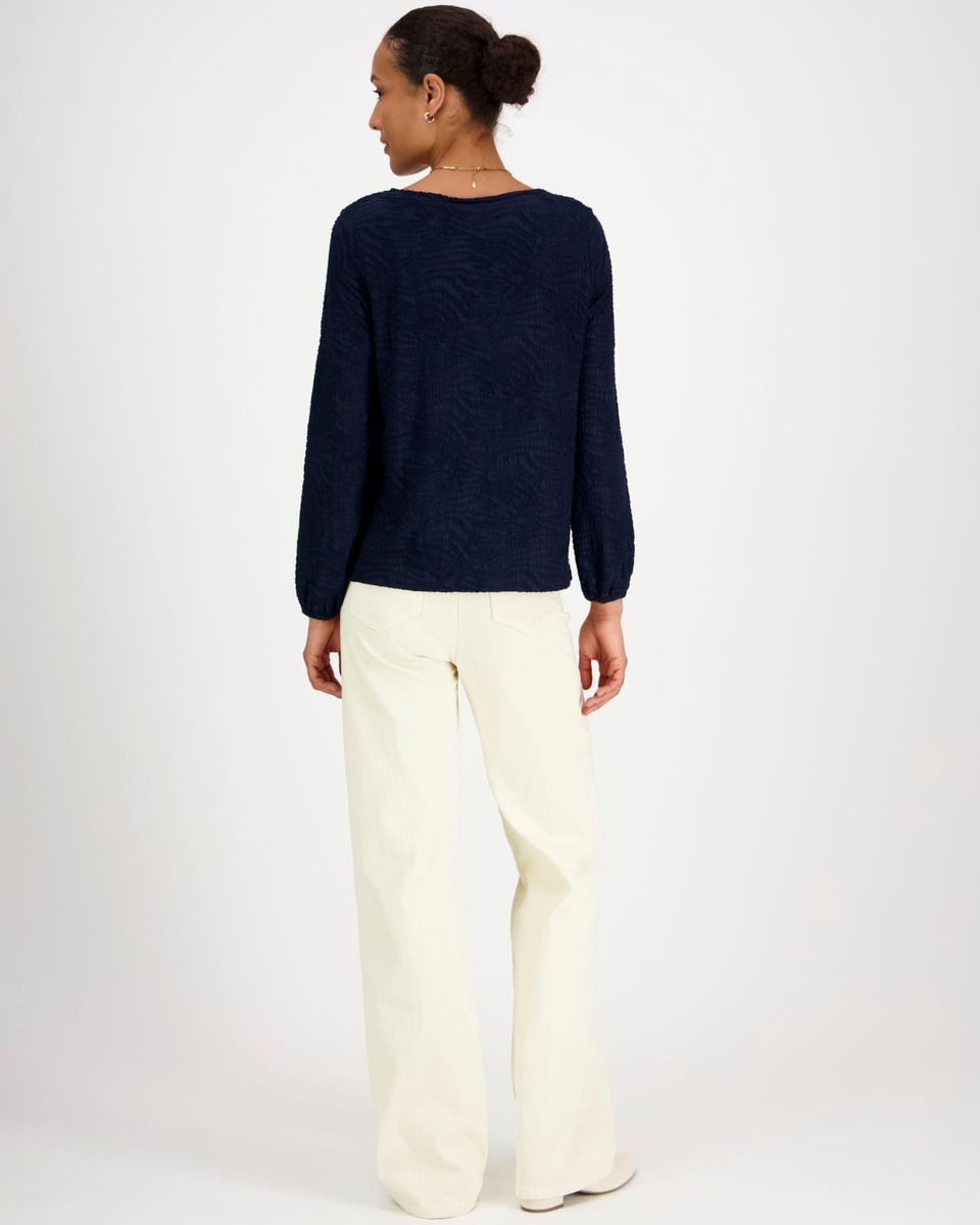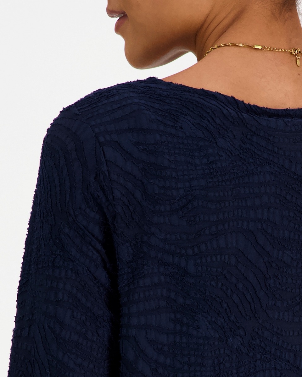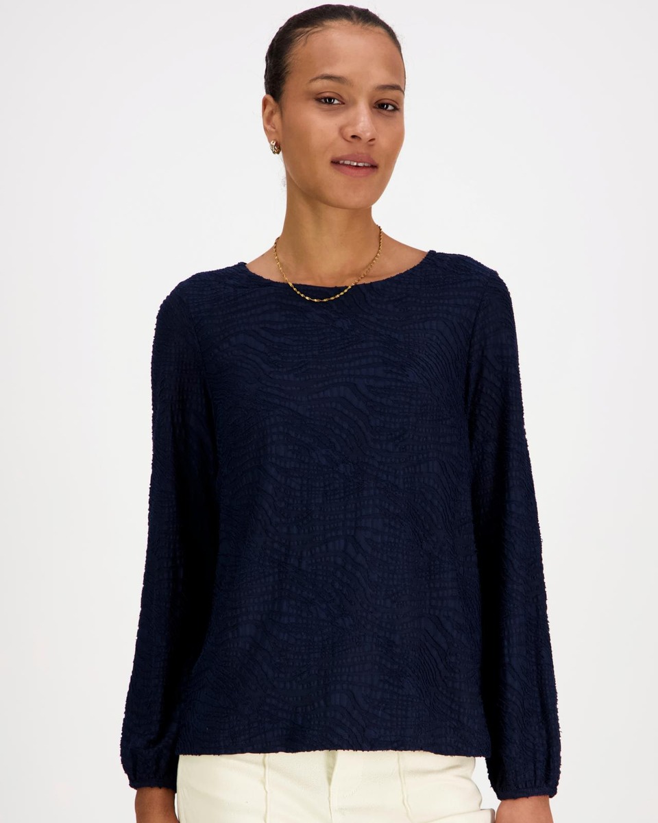 Aventuran pitkähihainen pusero on valmistettu kauniisti polttokuvioidusta, hieman läpikuultavasta ja joustavasta materiaalista. Rennon väljä malli ja helman joustava kuminauha lisäävät käyttömukavuutta. Puseron etu- ja takaosa on vuoritettu, hihat läpikuultavat. Koossa M rinnanympärys noin 104 cm ja pituus olalta helmaan noin 61 cm.