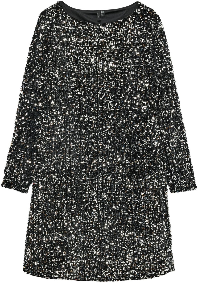 Kaunis pitkähihainen paljettimekko naisellisella venepääntie.